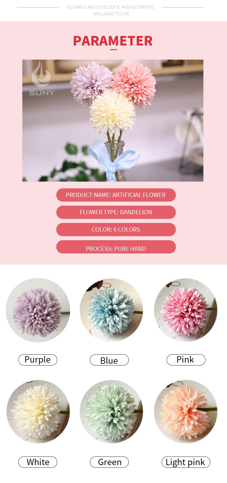 Название продукта: многоцветные Искусственные цветы Одуванчик поддельные растения пластиковые цветы Свадебные украшения для дома вечерние украшения для сада отеля Диаметр головки цветка: 9 см Высота головы цветка: 7 см Общая длина: 29 см Материал: Пластик Применение: офис, отдых, спальня, гостиная, журнальный столик, подоконник, балкон, дом, сад и так далее Применение праздник: свадьба, вечерние, день рождения, Рождество, День Святого Валентина, День благодарения, новый год, подарок на день рождения и так далее Цвет: вы выбираете узоры и блестки Минимальный заказ: 5 шт Время выполнения: 3-10 рабочих дней для запасов Доставка: ePacket/AliExpress Стандартная доставка/DHL/TNT/FedEx/UPS/EMS, морем, воздушным транспортом Время доставки зависит от страны и экспресс-доставки.