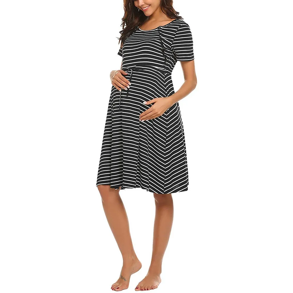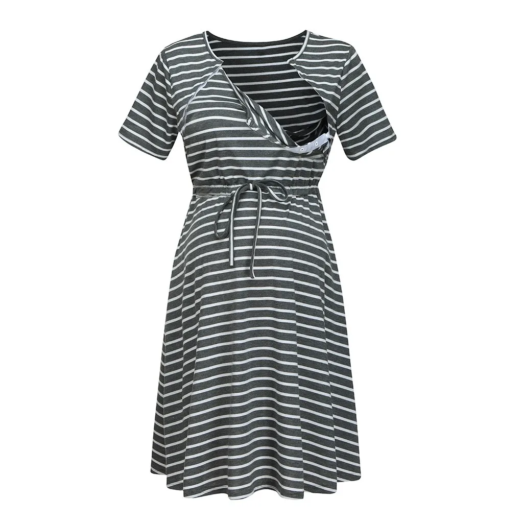 Women Maternity Short Sleeve Stripe Nursing Nightdress Breastfeeding Dress