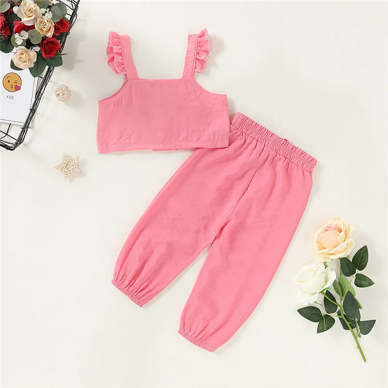 2 предмета, новая одежда для новорожденных девочек летний топ без рукавов на пуговицах, однотонные повседневные штаны, комплект одежды, От 1 до 6 лет