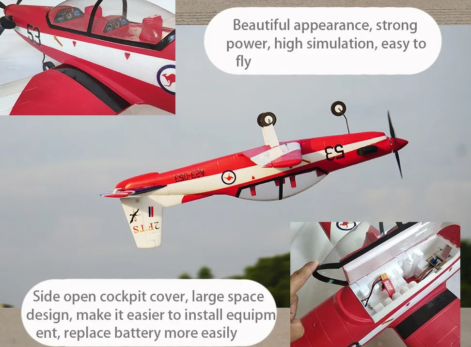 PC-9 SE: Размах крыльев: 1200 мм Длина: 1200 мм Летающий Вес: 1300 г Сервопривод: 9 г * 4 ESC: 30A бесщеточный ESC (комплект не входит в комплект) Пропеллер: 10,5*8*4 Мотор: 3536 бесщеточный двигатель кВ: 800 (комплект не входит в комплект) Батарея: 3S 11,1 V/2200 мАч литий-полимерный Батарея (не входит в комплект) Радио: 6-канальный, 2,4 г (не входит в комплект)