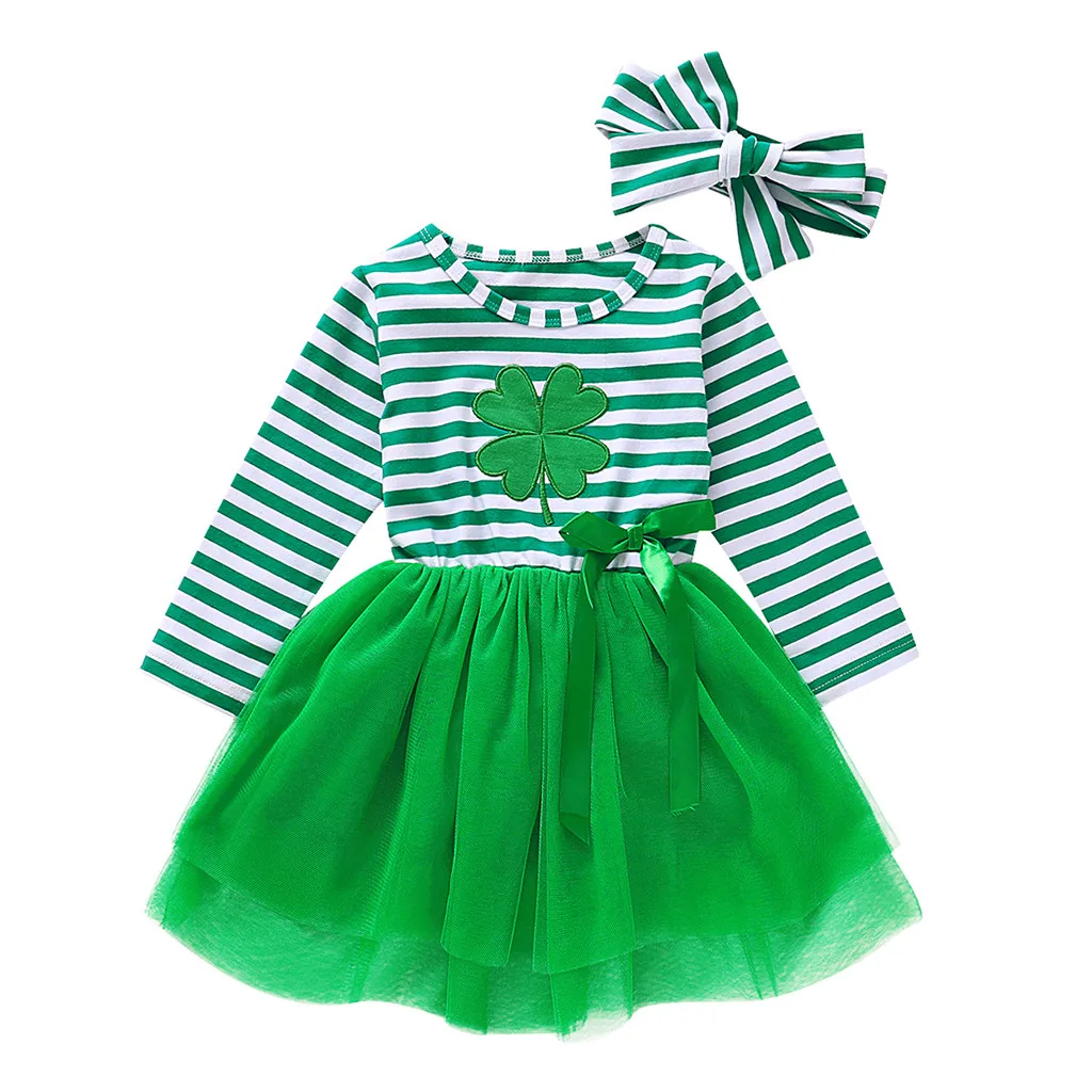 Платье принцессы в полоску с фатиновой юбкой для маленьких девочек на День Святого Патрика + повязка на голову