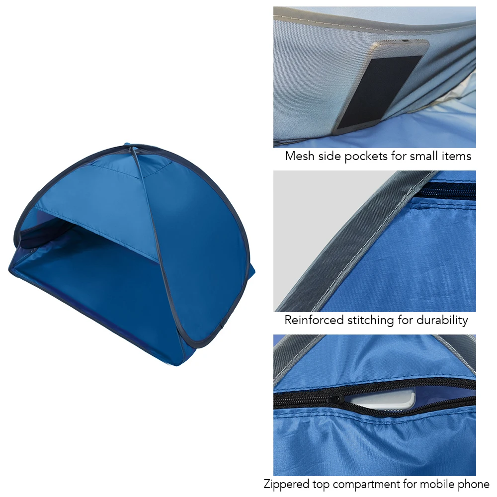 Этот мини-шатер изготовлен из солнцезащитной ткани, которая защищает ваши глаза и лицо от вредных солнечных лучей. Легко устанавливается и складывается, очень удобно носить с собой.