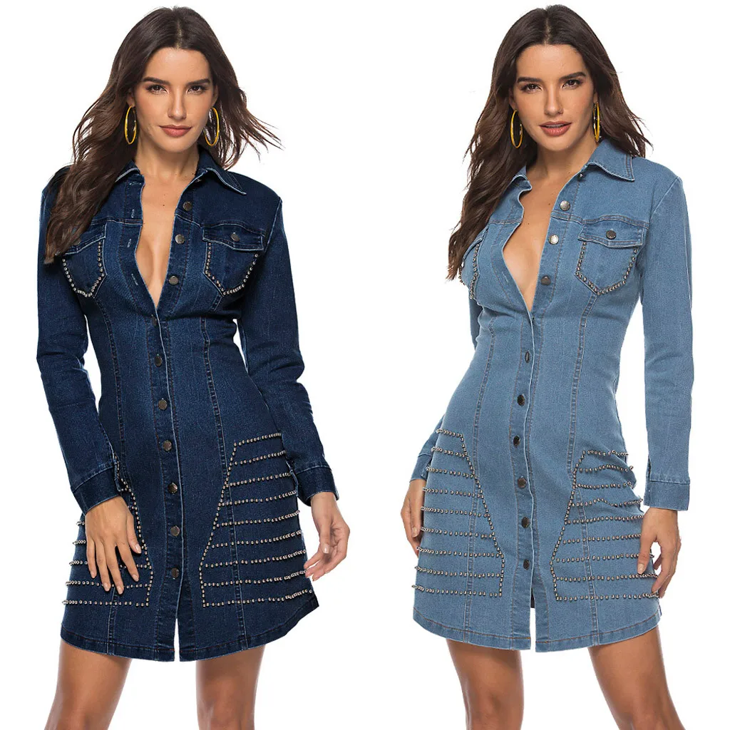 wЖенские сандалииМиниПлатье из джинсовой тканиПовседневноеДлинный рукав, отложной воротникКарман с заклепками; сезон веснаПлатье дамы сплошной тонкий Fit кнопки платья