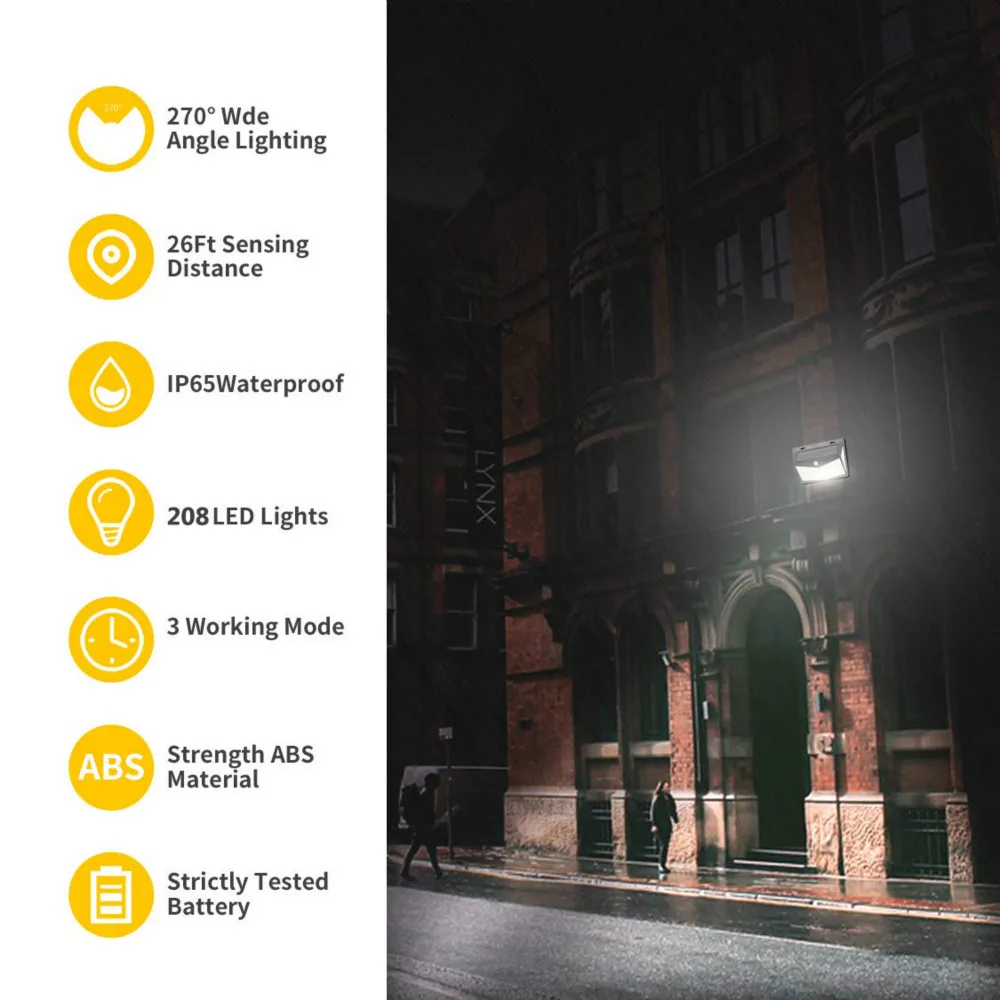 【 3 Modes】 датчик движения: наш Модернизированный супер яркий 208 светодиодный солнечный свет имеет 3 режима для ваших разнообразных потребностей: ① режим тусклого света, ② режим датчика тусклого света, ③ сильный режим датчика света. Обновленный датчик движения PIR обнаруживает людей до 12-20 футов/5-8 м под углом 180 градусов. Всегда готовы осветить ваш путь домой.