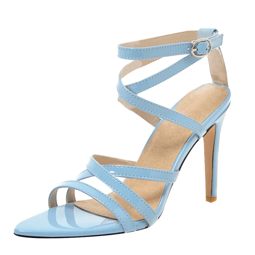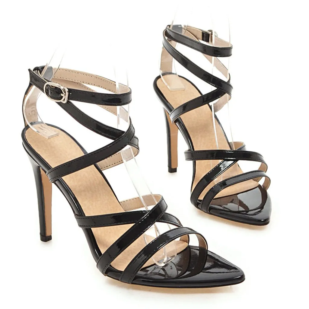 Женские однотонные лакированные босоножки на высоком каблуке с острым носком и пряжкой на лодыжке; Повседневная обувь