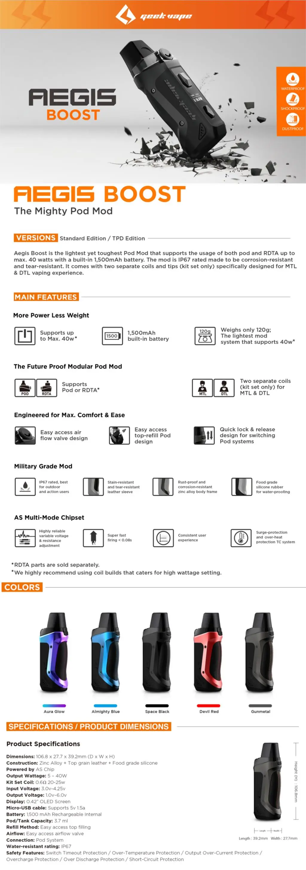 Комплект системы Geekvape Aegis Boost Pod изготовлен из сплава цинка, кожи и силикона и может использоваться как pod, так и RDTA. Geekvape Aegis Boost Pod Kit питается от аккумулятора 1500 мАч и выключается до макс. 40 Вт. Geekvape Aegis Boost использует чип IP67, водонепроницаемый, ударопрочный и пыленепроницаемый и 0,42 дюймовый oled-экран для отображения данных о паре. Картридж Aegis Boost имеет верхнюю фасовку и две отдельные катушки для поддержки MTL и DTL vaping.