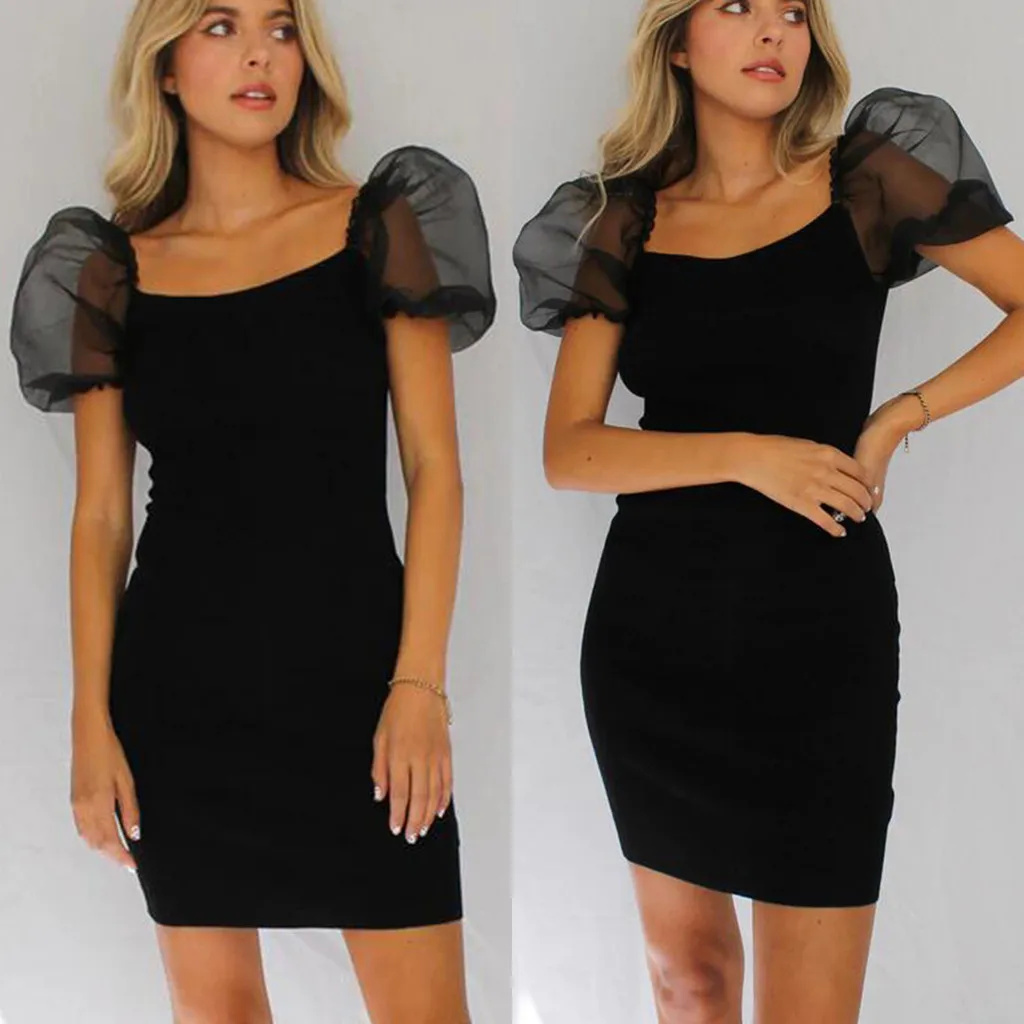 Особенности: сексуальный, квадратный воротник, однотонный, короткий рукав, облегающее, мини-платье, пышные рукава, перспективная сетка, повседневная одежда, летнее платье, летнее Повседневное платье ..