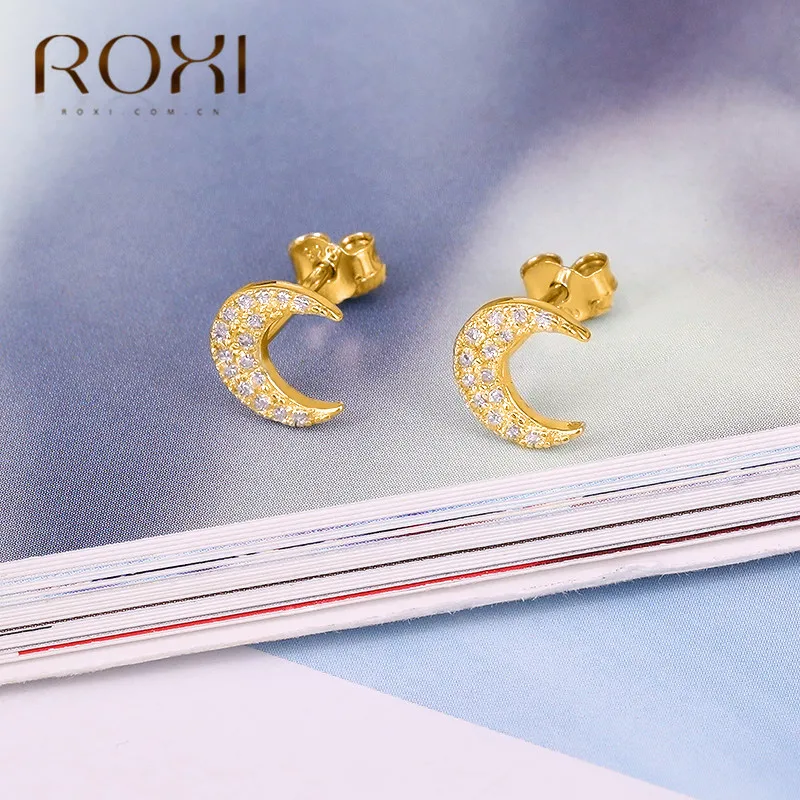 Женские серьги-гвоздики ROXI Lovely Gold CZ Crescent Moon, минималистичные вечерние ювелирные изделия из стерлингового серебра 925 пробы