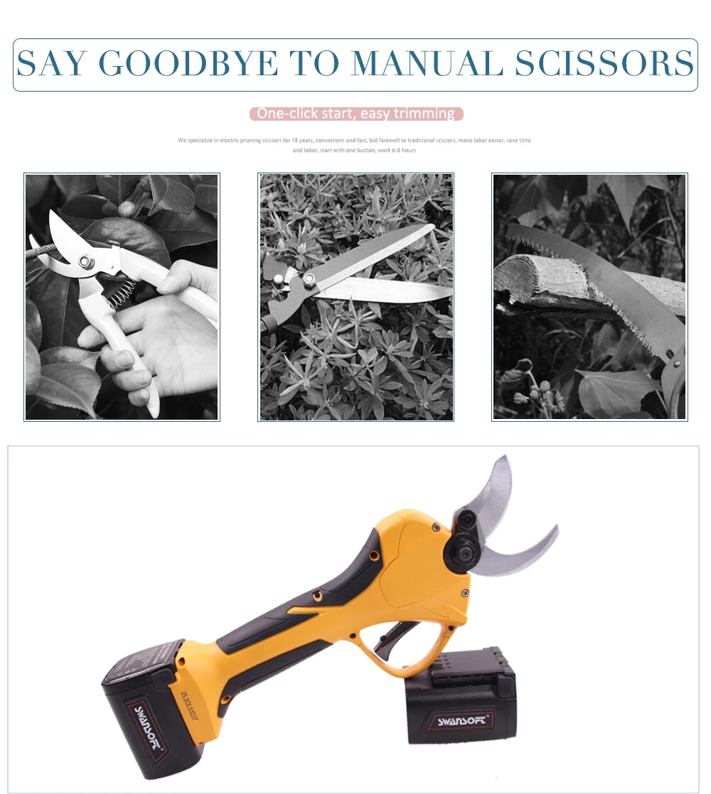 Диаметр резки: 40 мм Номинальное напряжение: 25,2 в 2 Ач Количество батарей: батареи X 3 шт. Время зарядки: 2-3 часа Время работы: один аккумулятор 2,5-3,5 часов; Три батареи 8-10Hours Тип зарядного устройства: зарядное устройство 3 в 1 Общий вес: 1200 г Рабочая температура:-10 ℃ ~ 60 ℃ Преимущества: 1. Отображение экрана на корпусе секатора. Это очень полезно для сельскохозяйственных работников с отображением емкости батареи, времени резки и отображения кода ошибки, напоминания о времени обслуживания и т. д. Таким образом, наши работники фермы не будут беспокоиться о том, когда заряжать, когда делать обслуживание. 2. Беспроводной секатор на батарейках. Это позволяет экономить рабочую силу, особенно для старых сельскохозяйственных работников, что позволяет им чувствовать себя легко, когда они занимаются обрезкой. 3. 2 в 1 Зарядное устройство Зарядное устройство может заряжать 2 батареи одновременно, поэтому оно может сэкономить время зарядки аккумулятора, чем обычное зарядное устройство.