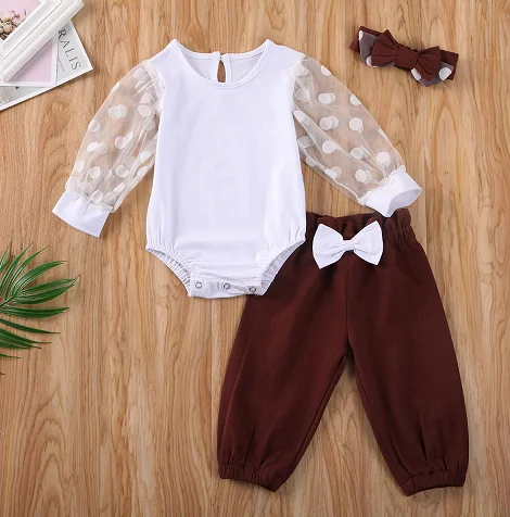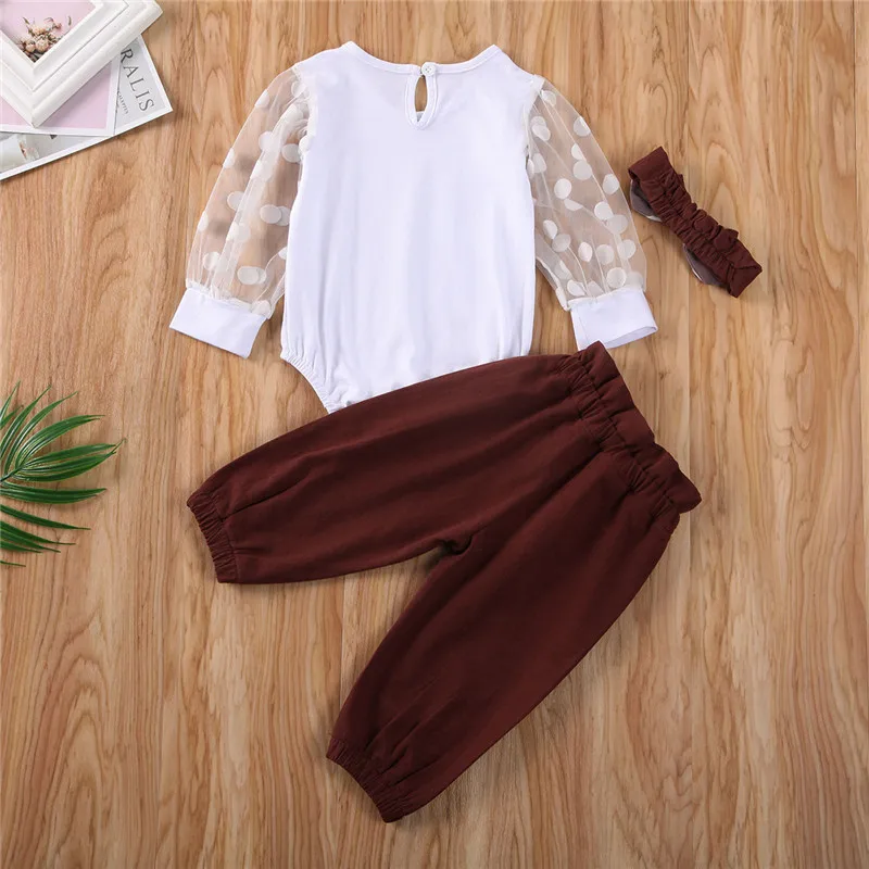 3PCS Kids Baby Girls Outfit Clothes Set 2020 Mesh Dot See Through Long Sleeve Romper Bodysuit Long Pants Bowknot Headband 0-24M