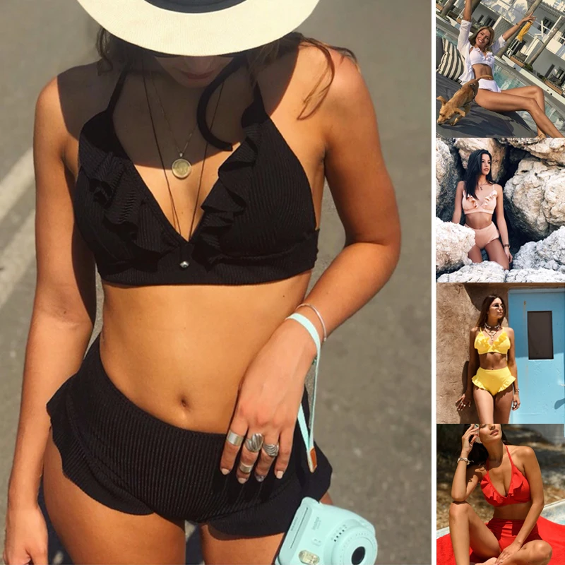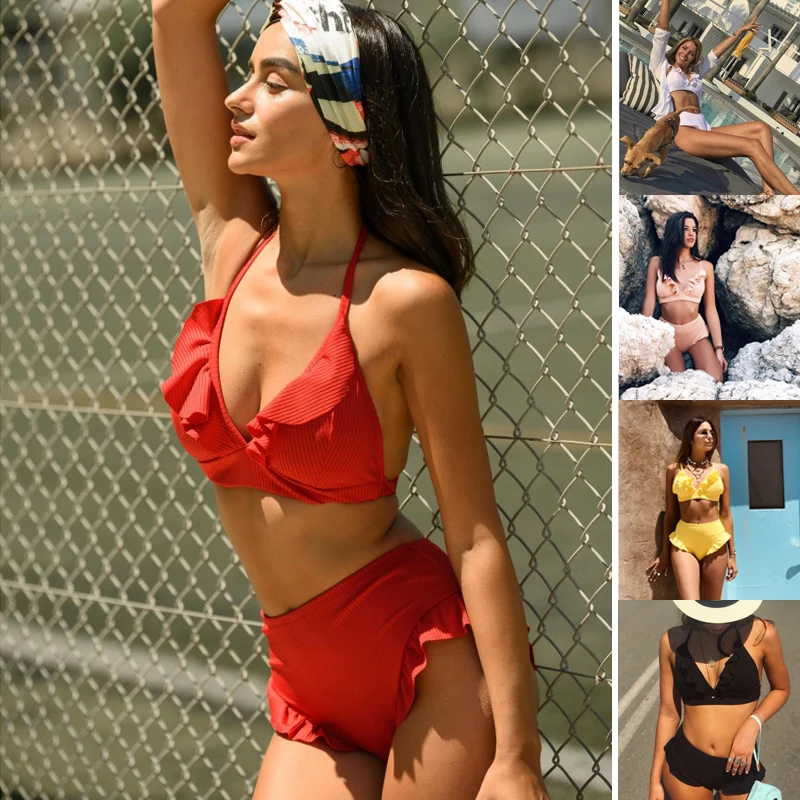 Женский пуш-ап Мягкий Купальник Ремень резьбовой гофрированный сплошной высокой талией бикини