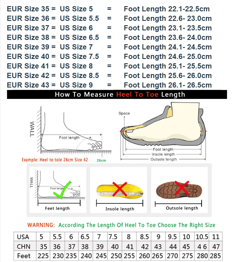 Размер обуви может не соответствовать стандартам вашей страны/региона, Пожалуйста, измерьте длину своей стопы и выберите подходящий размер обуви! Европейский размер предназначен только для справки, пожалуйста, проверьте длину стопы!
