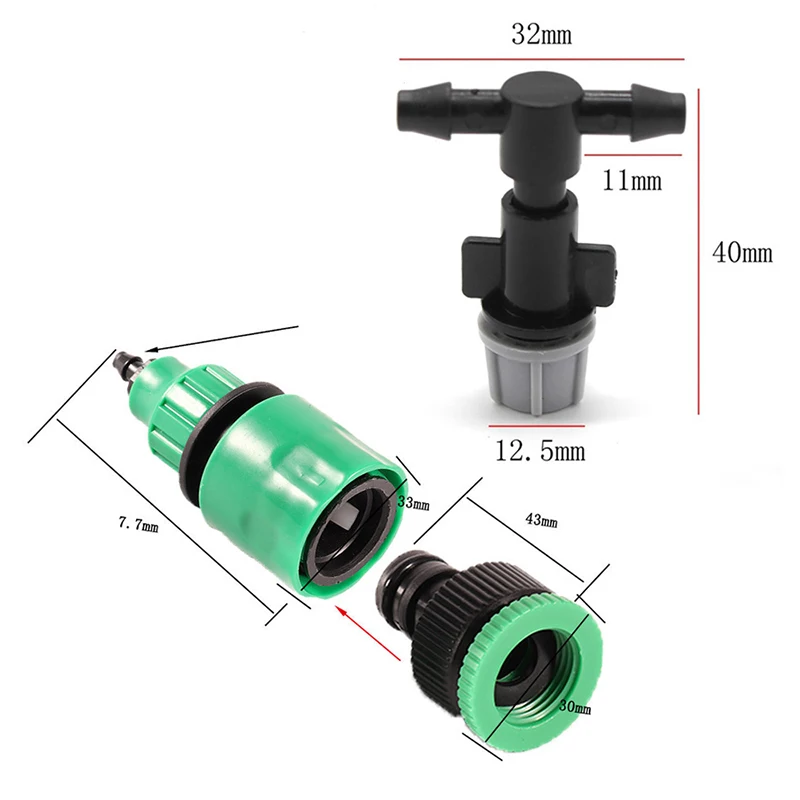 1*5 м ПВХ трубка, 1 * Быстрый разъем, 7 * запотевающие насадки, 1 * одиночные колючие муфты, 1 * шланговая розетка, 6*4/7 тройник соединитель, 2 * штепсельные клапаны
