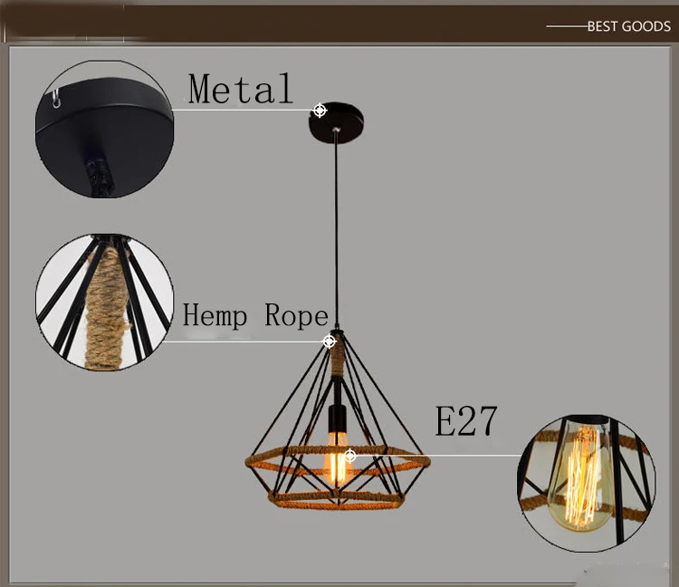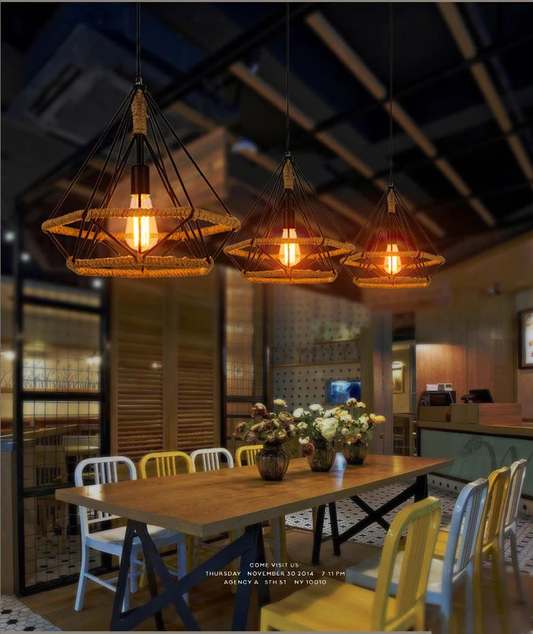 Алмазная клетка Американский Сельский пеньковая веревка лампа промышленность Ветер ретро огни классическое исследование простой Лофт Ресторан люстра Материал: металл Применение: кафе-бар в гостиной и т. д.