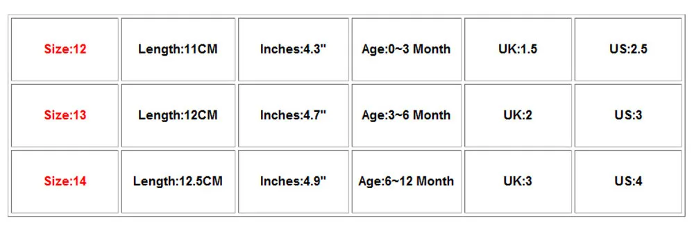 | Размер: 12 | Длина: 11 см | Дюймы: 4,3" | Возраст: 0 ~ 3 Месяц | Великобритания: 1,5 | США: 2,5 |