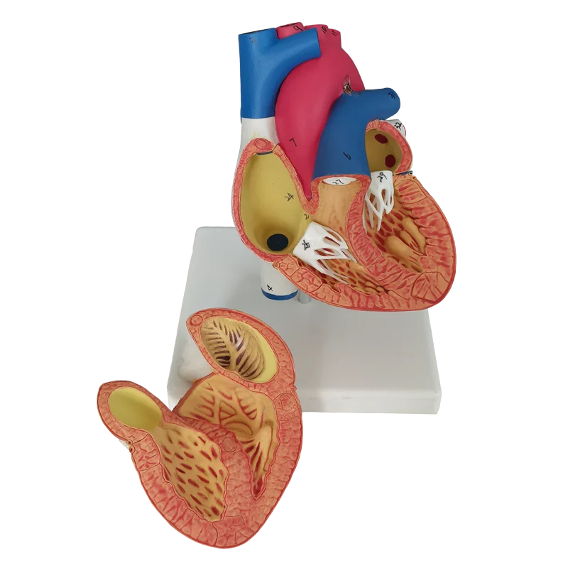 Модель сердца имеет приблизительно жизненный размер для анатомического исследования сердечных структур и расслаивается на две части для эффективной демонстрации. Модель имеет съемную переднюю стенку сердца для просмотра камер и клапанов.