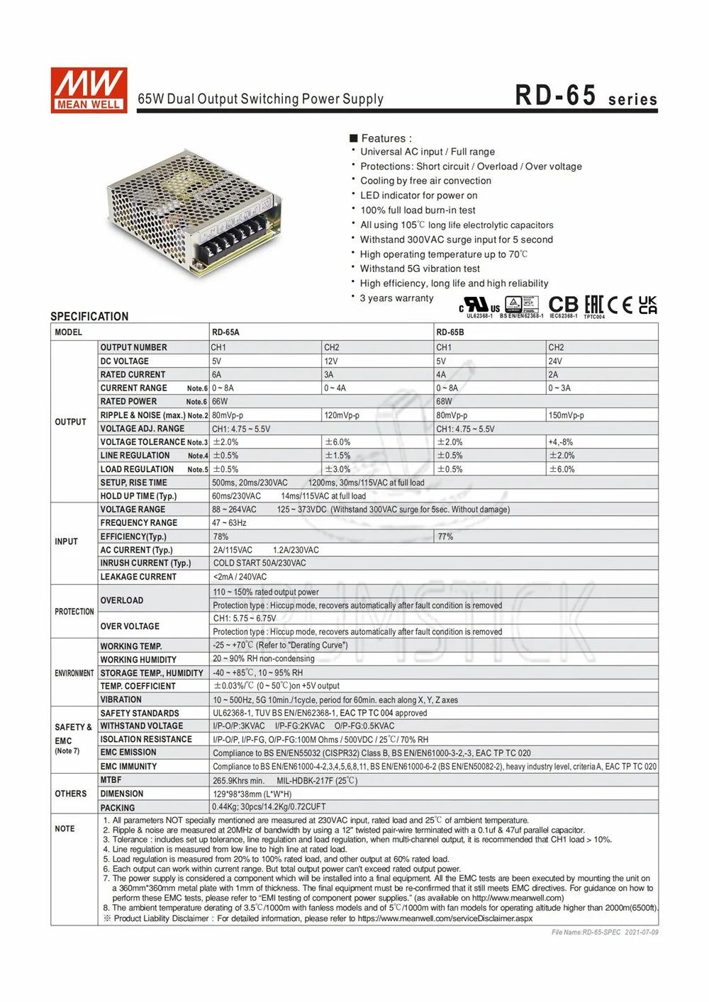 Средний хорошо закрытый тип RD-65 без PFC RD серии 65 Вт двойной выходной импульсный источник питания несколько выходных напряжений