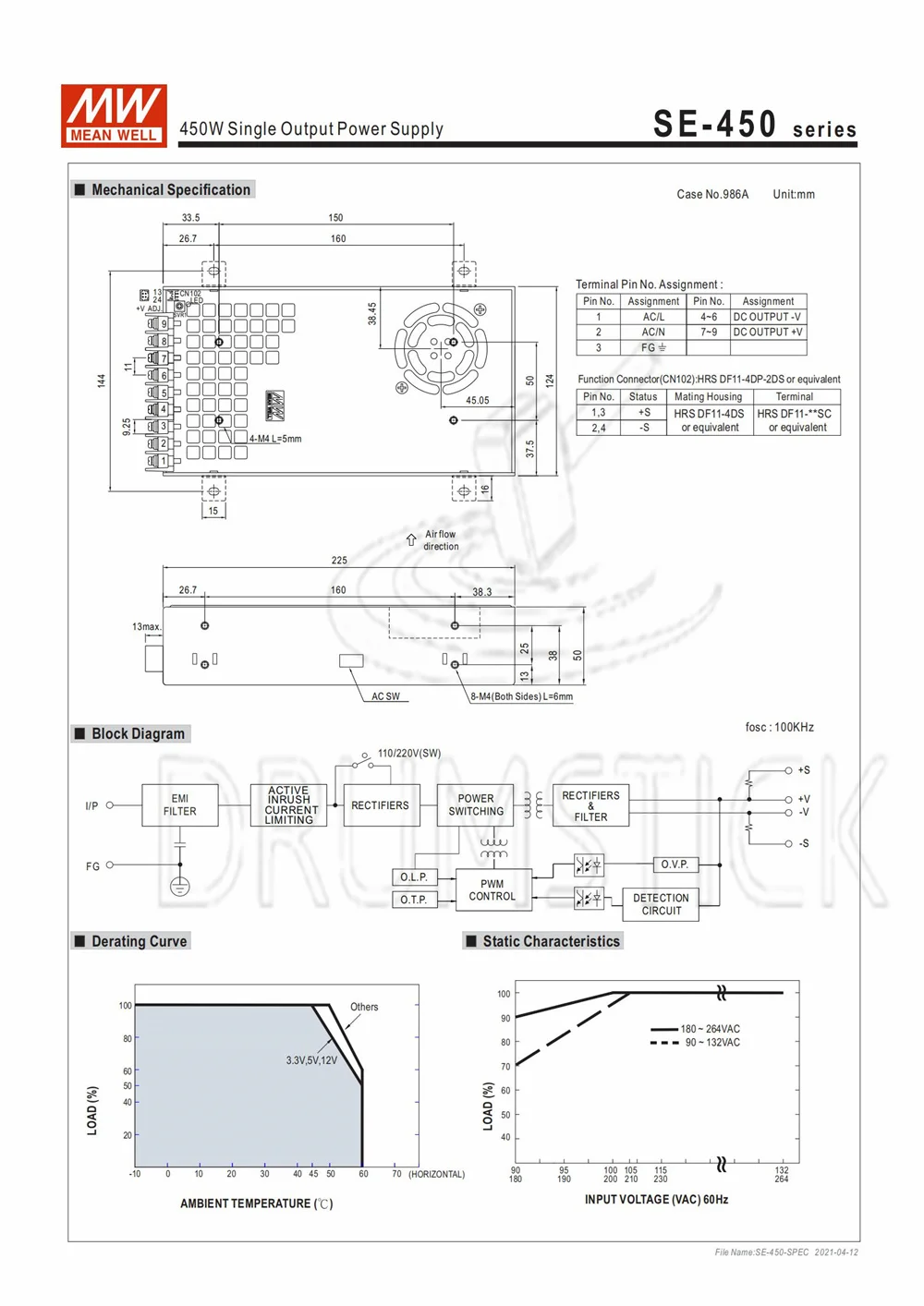 MEAN WELL Enclosed Type SE-450 Non-PFC SE series 450W Single Output Power Supply