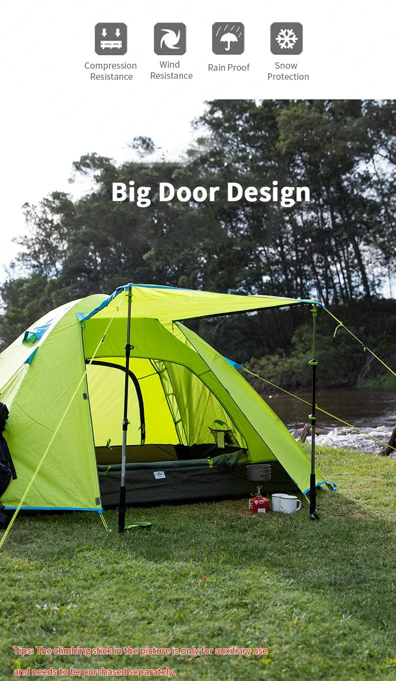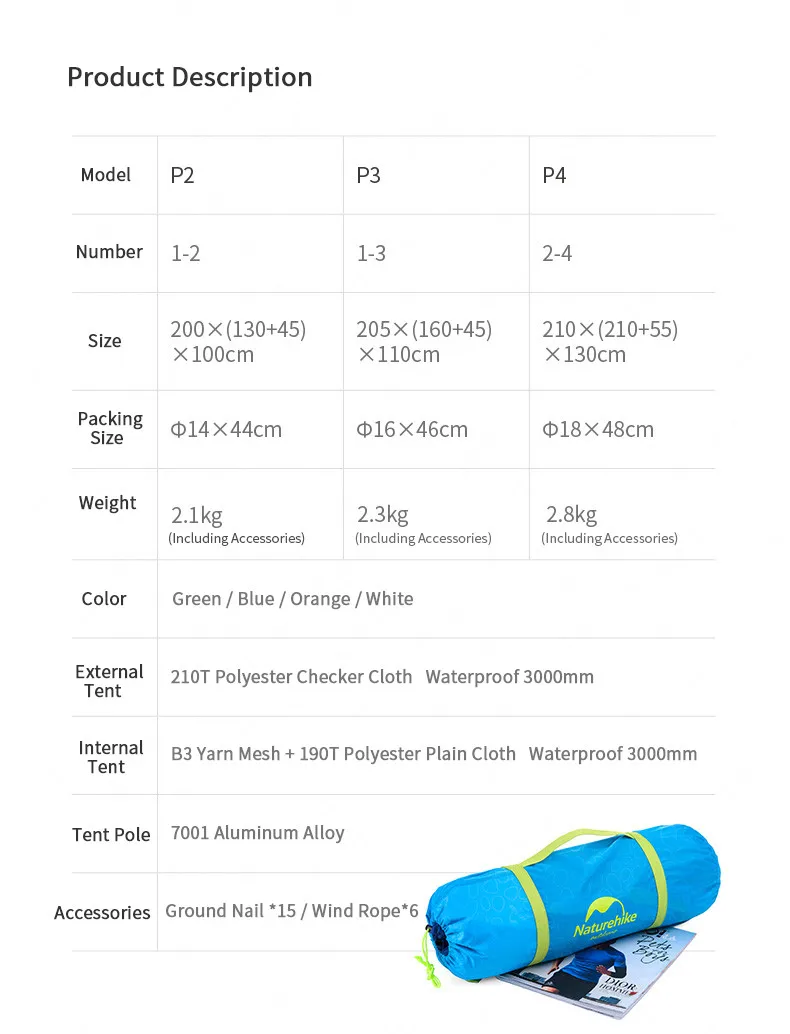 Бренд: Naturehike Люди: P2(1-2 человека)/P3(1-3 человека)/P4(2-4 человека) Материал палатки: полиэфирная ткань 210T Индекс водонепроницаемости палатки: pu3000мм Внутренний материал: полиэфирная ткань 210T Материал сетки: воздухопроницаемая сетка B3 Материал дна палатки: ткань Оксфорд 150D Индекс водонепроницаемости дна палатки: pu3000мм Полюса: 7001 алюминий Размер P2: 200 *(130 + 45)* 100 см Размер P3: 205 *(160 + 45)* 110 см Размер P4: 210 *(210 + 55)* 130 см Вес нетто: P2 = 2,1 кг/P3 = 2,3 кг/P4 = 2,8 кг Аксессуары: колышки * 15, веревка * 6, столб * 2, сумка для аксессуаров * 1