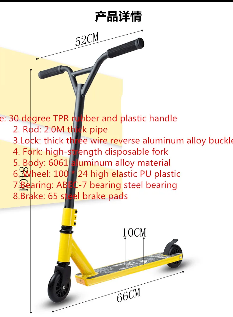 . Ручка: 30 градусов TPR резиновая и пластиковая ручка 2. Стержень: 2,0 м Толстая труба 3. Замок: толстая трехпроводная обратная Пряжка из алюминиевого сплава 4. Вилка: высокопрочная одноразовая вилка Может быть оснащен системой безопасности SCS 5. Корпус: 6061 материал из алюминиевого сплава 6. Колесо: 100*24 высокоэластичное PU пластиковое ядро колеса Алюминиевое ядро колеса 7. Подшипник: ABEC-7 подшипник стальной 8. Тормоз: 65 стальных тормозных колодок