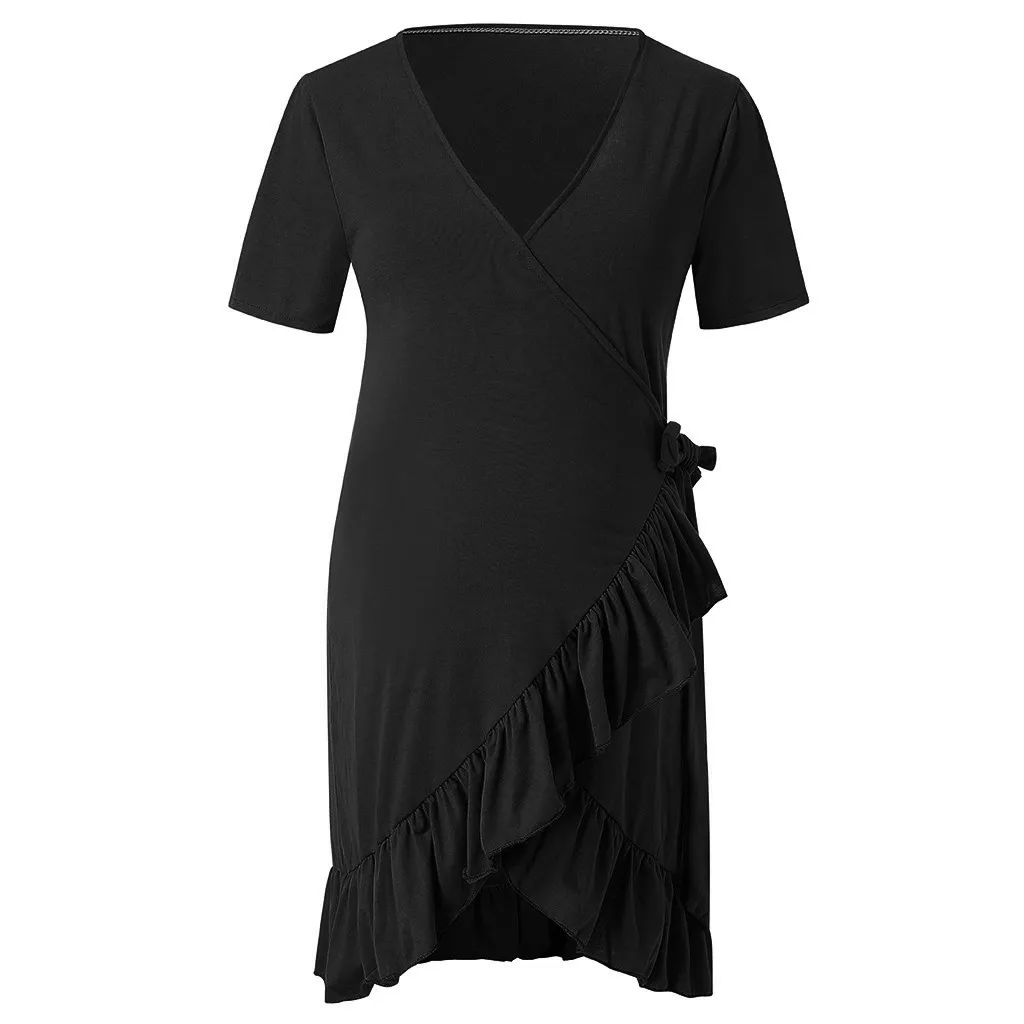 Women Maternity Fashion Belt V Neck Short Sleeve Ruffle Dress