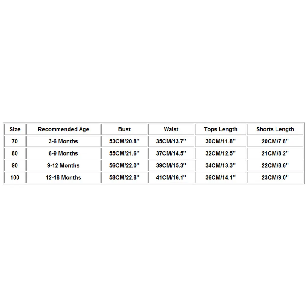Таблица размеров:Размер Рекомендуемый возраст Бюст Талия Длина топа Длина шорт 70 3-6 месяцев 53 см/20,8'' 35 см/13,7'' 30 см/11,8'' 20 см/7,8 дюйма 80 6-9 месяцев 55 см/21,6'' 37 см/14,5 дюйма 32 см/12,5'' 21 см/8,2'' 90 9-12 месяцев 56 см/22,0'' 39 см/15,3'' 34 см/13,3 дюйма 22 см/8,6'' 100 12-18 месяцев 58 см/22,8'' 41 см/16,1'' 36 см/14,1 дюйма 23 см/9,0 дюйма Размер: 70 Рекомендуемый возраст: 3-6 месяцев Обхват груди: 53 см/20,8 дюйма Талия: 35 см/13,7 дюйма Длина топа: 30 см/11,8 дюйма Длина шорт: 20 см/7,8 дюйма Размер: 80 Рекомендуемый возраст: 6-9 месяцев Обхват груди: 55 см/21,6 дюйма Талия: 37 см/14,5 дюйма Длина топа: 32 см/12,5 дюйма Длина шорт: 21 см/8,2 дюйма Размер: 90 Рекомендуемый возраст: 9-12 месяцев Обхват груди: 56 см/22,0 дюйма Талия: 39 см/15,3 дюйма Длина топа: 34 см/13,3 дюйма Длина шорт: 22 см/8,6 дюйма Размер: 100 Рекомендуемый возраст: 12-18 месяцев Обхват груди: 58 см/22,8 дюйма Талия: 41 см/16,1 дюйма Длина топа: 36 см/14,1 дюйма Длина шорт: 23 см/9,0 дюйма