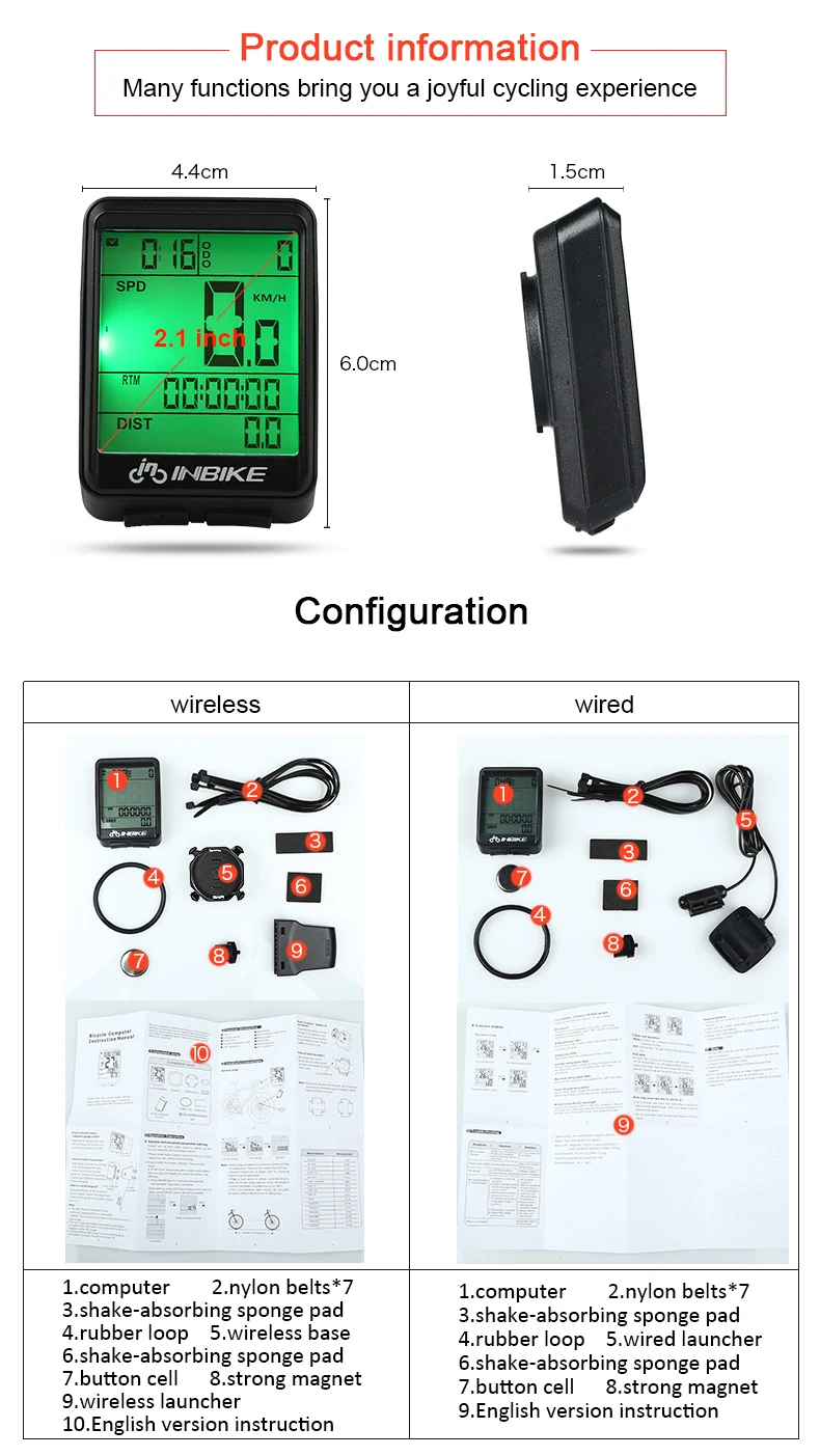 Беспроводной Велосипедный компьютер: 1 * одометр 1 * Беспроводной Base1 * Беспроводная база Sensor1 * Magnet2 * Клей Sticker5 * Straps1 * USB кабель 1 * Руководство пользователя проводной велосипедный компьютер: 1 * одометр 1 * Base1 * Базовый датчик 1 * Magnet2 * клейкая лента 5 * лента 1 * USB кабель (длина 107 см) 1 * Руководство пользователя