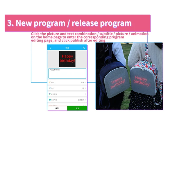 1. Если вам нужно почистить рюкзак, пожалуйста, выньте экран, чтобы не повредить воду. 2. Управление мобильным приложением может изменить дисплей, текст, изображения, анимацию, можно отображать различными способами. 3. Продукты не содержат питания, они должны иметь свой мобильный источник питания или другой режим питания 4: воспроизведение памяти. В том случае, если товара нет в питания, он будет отображать последний эфир его снова, 5: в любой момент проигрывается сцена, индивидуальность показывает классность, радует эффект сюрприза. Упаковочный лист: 1 * рюкзак, 1 * руководство на английском языке
