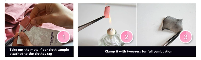 [Обратите внимание] после того, как образец ткани полностью сгорел, если он показывает очень чистую, тонкую и аккуратную металлическую сетку, это указывает на то, что материал ткани очень хороший и может эффективно защищать излучение.
