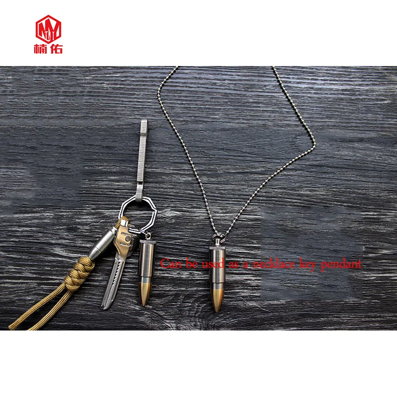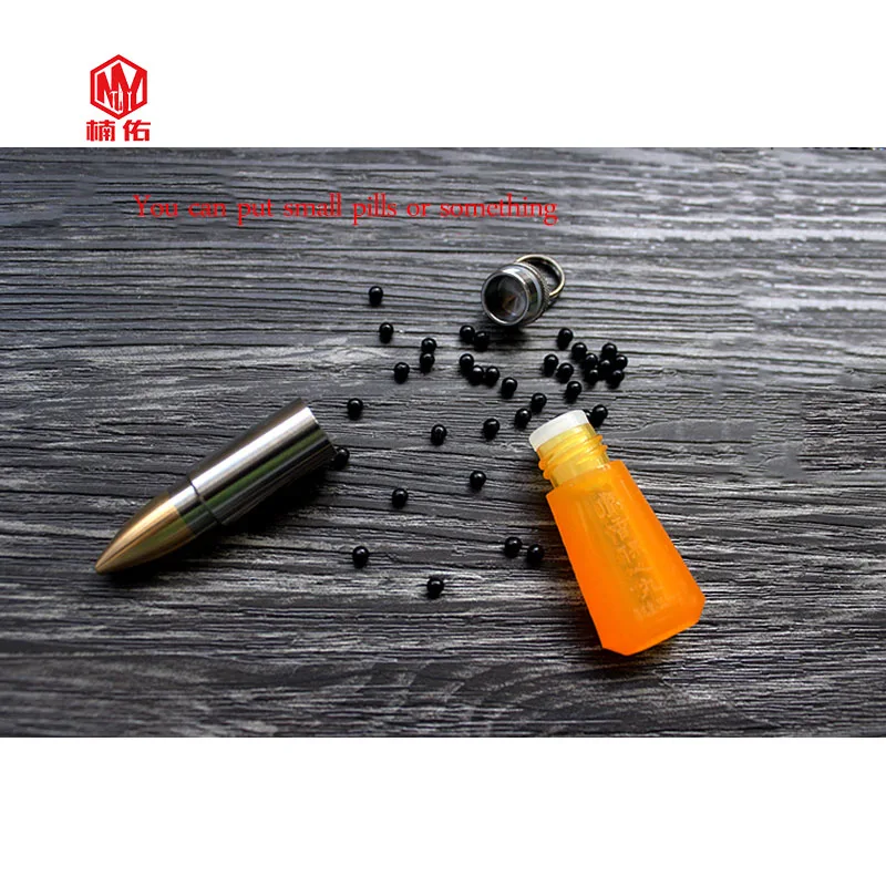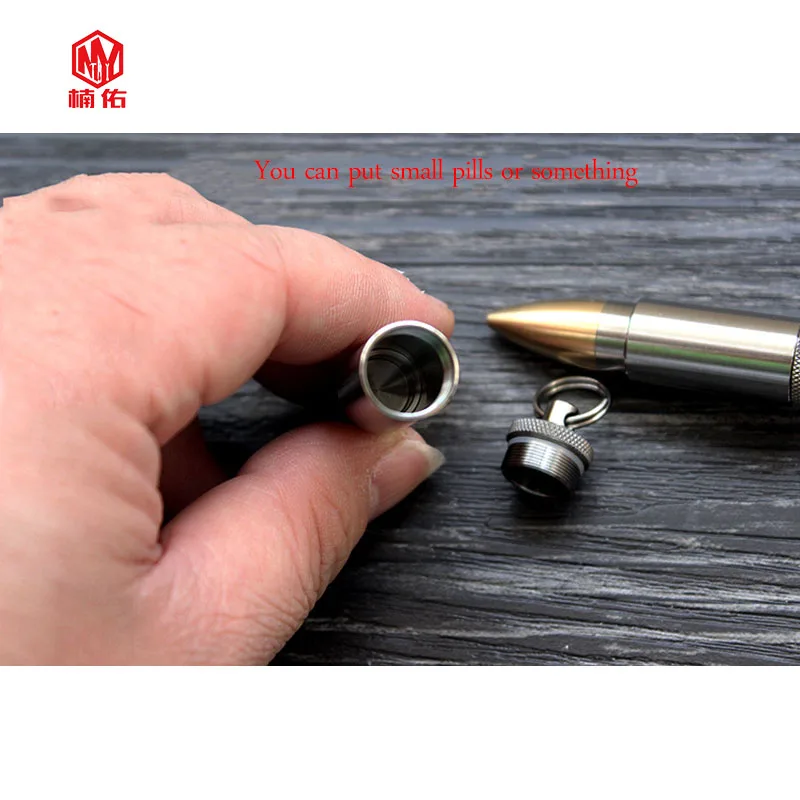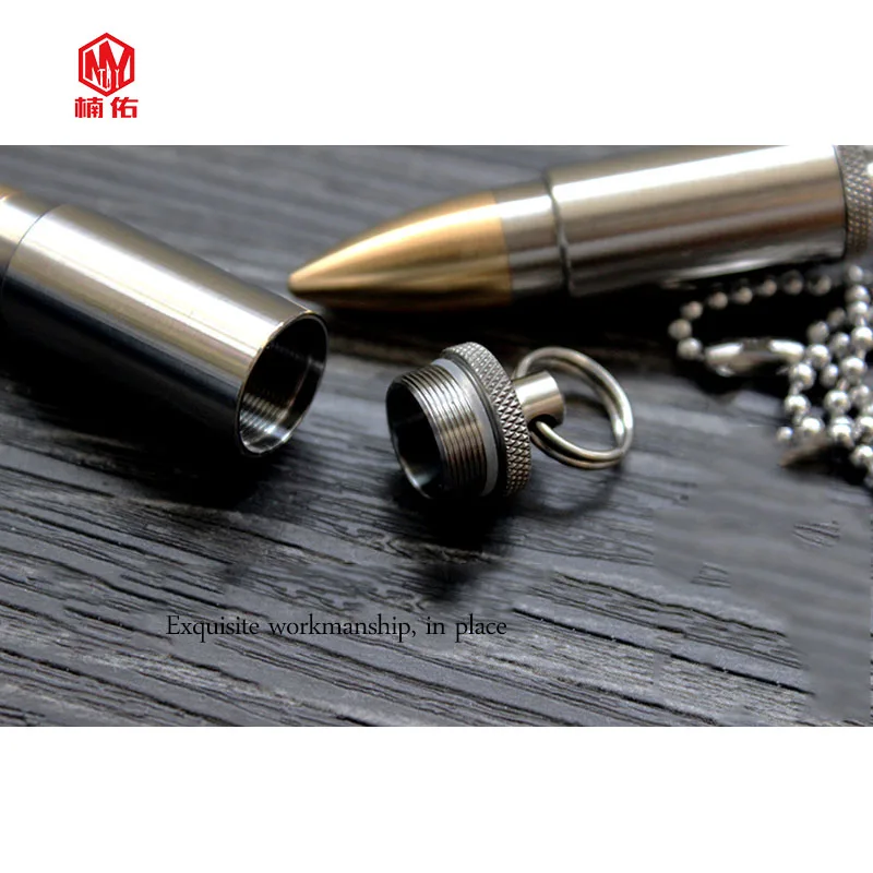 Качество изготовления изделия очень тонкое, с деталями на месте, и его можно использовать в качестве ожерелья или брелока, головки на молнии и так далее. Внутренний склад может быть открыт для небольших вещей, таких как таблетки, которые имеют хорошую герметизацию и никаких проблем с дайвингом. Материал: титановый сплав + латунь (кольцо для ключей также титановое) Измерение размера Размер внешнего вида: Длина 56 мм Диаметр: 13 мм Внутренний размер: высота 22 мм диаметр: 11 мм Вес: около 15 грамм