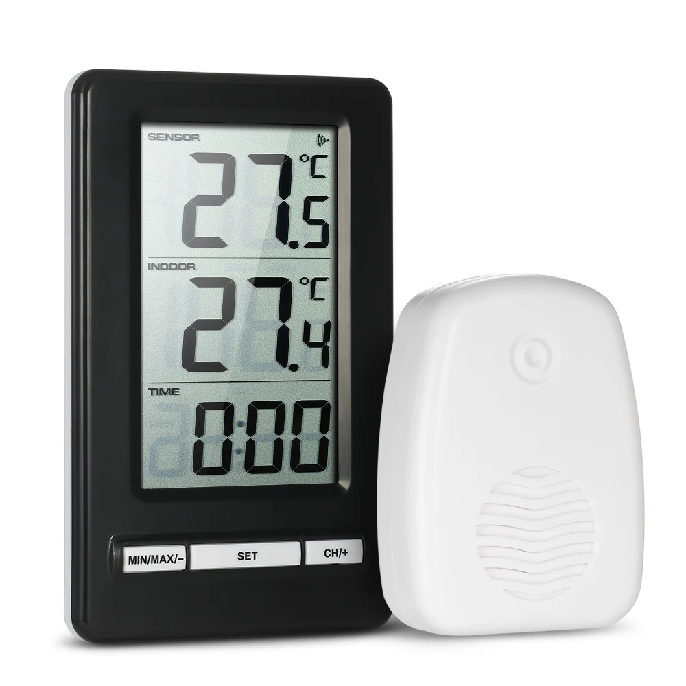 Беспроводной термометр используется для измерения температуры в помещении и на улице. С ЖК-дисплеем вы можете легко и четко читать значения. Его можно разместить на столе или повесить на стену.