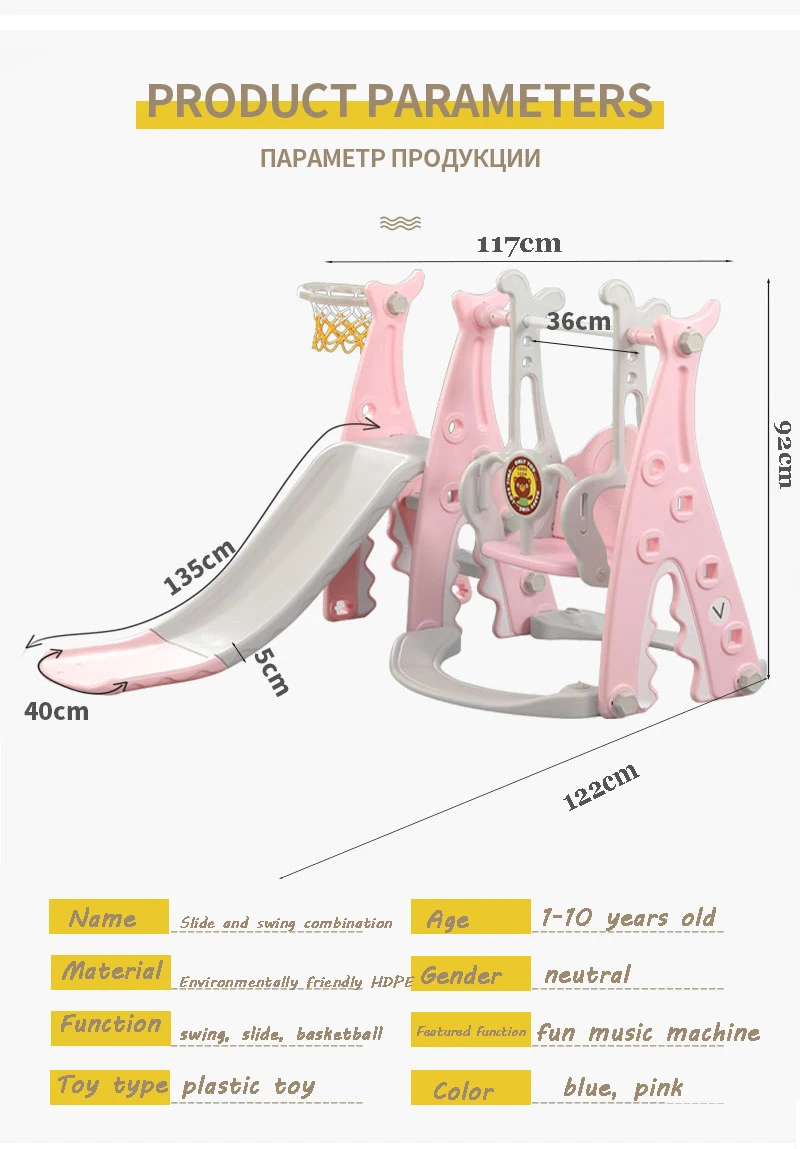 Информация о продукте: Цвет:Милый розовый, элегантный синий Размеры:Высота * 150 см, ширина * 135 см, длина * 180 см, толщина горки * 5 см, длина горки * 135 см, ширина горки * 40 см, ширина качания * 36 см Материал изделия:Экологически чистый, нетоксичный и здоровый пластиковый материалФункция: качели, горка, Баскетбол три в одном Упаковочный лист:Детская горка «Три в одном» Подходит для возраста:От 0 до 4 лет Советы:У нас есть несколько зарубежных складов, пожалуйста, выберите подходящее место для вашей доставки. Это позволит вам более эффективно доставлять товар. Если у вас есть какие-либо вопросы, пожалуйста, не стесняйтесь обращаться в нашу службу поддержки клиентов, мы будем рады ответить на ваши вопросы!