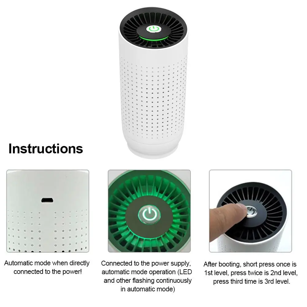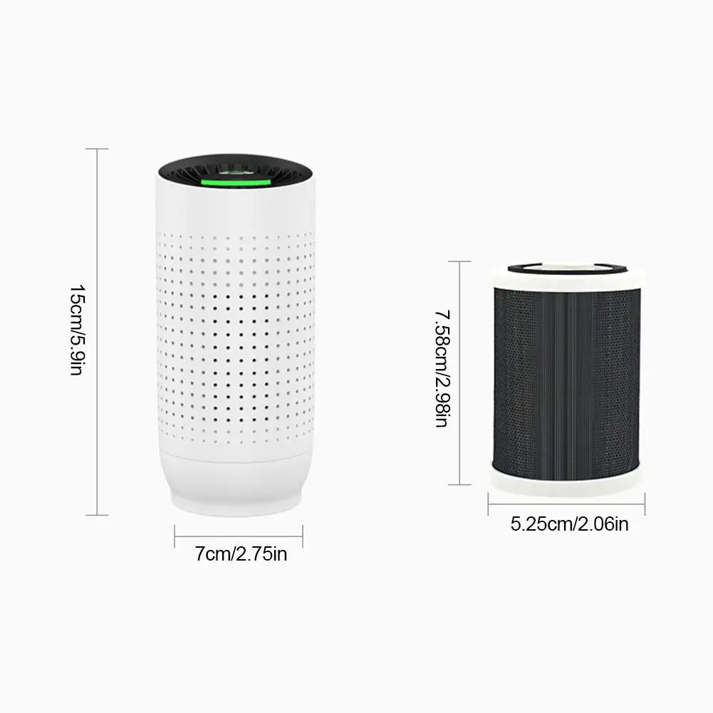 Технические характеристики:Место использования (использование не ограничено следующим списком)Семья и жилых помещенийДля офисаГаражКладоваяНаименование товара: небольшой очиститель воздухаМетод очистки: 3 композитных фильтраСрок службы фильтра: нормальное использование 3-6 месяцев (в зависимости от условий использования, срок службы фильтра отличается)Питание: DC 5 В/1A USBОбласть применения: 3-8m2Мощность: 3,5 WРазмер: около 70x150 мм/2,76*5,91 дюймаМатериал: АБС-пластикОбъем воздуха: 3 уровняФильтрующий элемент: H13