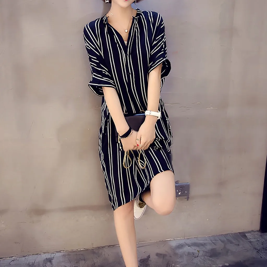Женское Повседневное платье-рубашка с короткими рукавами, v-образным вырезом и принтом в полоску