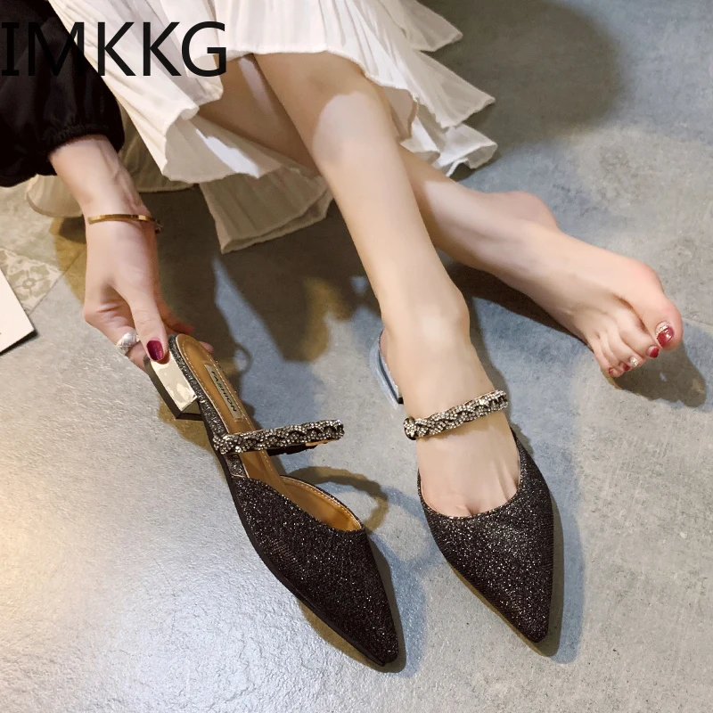 Женские шлепанцы; Летние туфли без задника; Женские шлепанцы из искусственной кожи; Женские туфли без задника на низком каблуке с острым носком и кристаллами; Zapatos De MujerUS $15,00