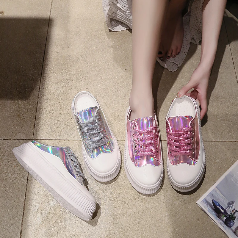 Летние женские тапочки на резиновой подошве из искусственной кожи; Уличные тапочки на плоской подошве; Модные Лоферы без застежки; Женские шлепанцы на платформе; Цвет розовый, серебристыйUS $15,20