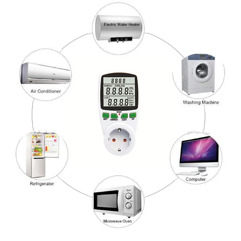 Этот продукт может легко измерить потребление энергии и стоимость ваших электрических приборов, таких как электрическая плита, микроволновая печь, холодильник и т. д.