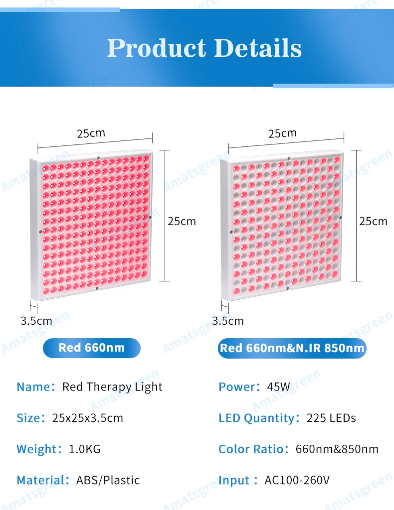 Преимущества различной длины волны: Выберите наиболее биологически длину волны является ключом к оптимизации преимуществ красный светильник и терапия около-Инфракрасный светильник. Красный светильник и длина волны около инфракрасного диапазона признаны за специальные регенеративные и терапевтические результаты, которые дают организму. Красный светильник длиной волны простирается от приблизительно 630нм до 810нм, а наиболее Научно доказанные преимущества-красный 630нм и темно-красный 660нм. Ближний инфракрасный свет начинается с 730 нм и продлевается до 1000нм. Около инфракрасного 810 нм, 830 нм и 850 нм длины волн, которые были научно доказаны, чтобы дать пользу. Как вы можете знать, 660nm mix 850nm (половина на половину) Длина волны была доказана, чтобы обеспечить терапию кожи и ткани. Длина волны 660нм (красный светильник) Длина волны 660нм проникает глубже, чем длина волны 630нм, длина волны 660нм достигает всего диапазона тканей кожи, что способствует заживлению и регенерации. Преимущества снижения усталости при тренировках, воспаления, отечности следуют за травмами и невропатными болями; Улучшенное заживление костей и ускоренное заживление ран. Длина волны 850 нм (ближний инфракрасный светильник) Ближний инфракрасный светильник длиной волны больше, чем красный светильник длиной волны, от 700нм до 1000нм, который проникает глубже в ткани в клетки тела и может пройти через кость, чтобы помочь с заживлением глубоких ран, мышечные боли, травмы нерва или боли в суставах; Большинство людей выбирают ближний инфракрасный свет для лечения.
