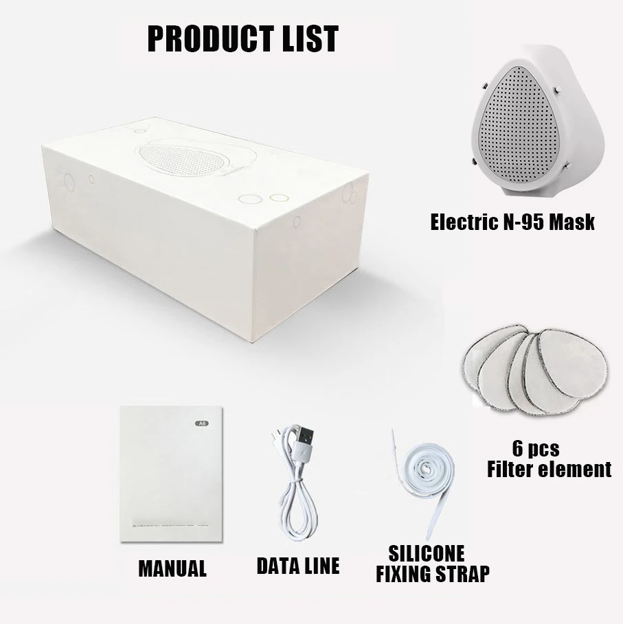 Электрическая маска; Маска фильтрующий элемент * 6; USB кабель для зарядки; Силиконовый ремешок; Инструкции по использованию