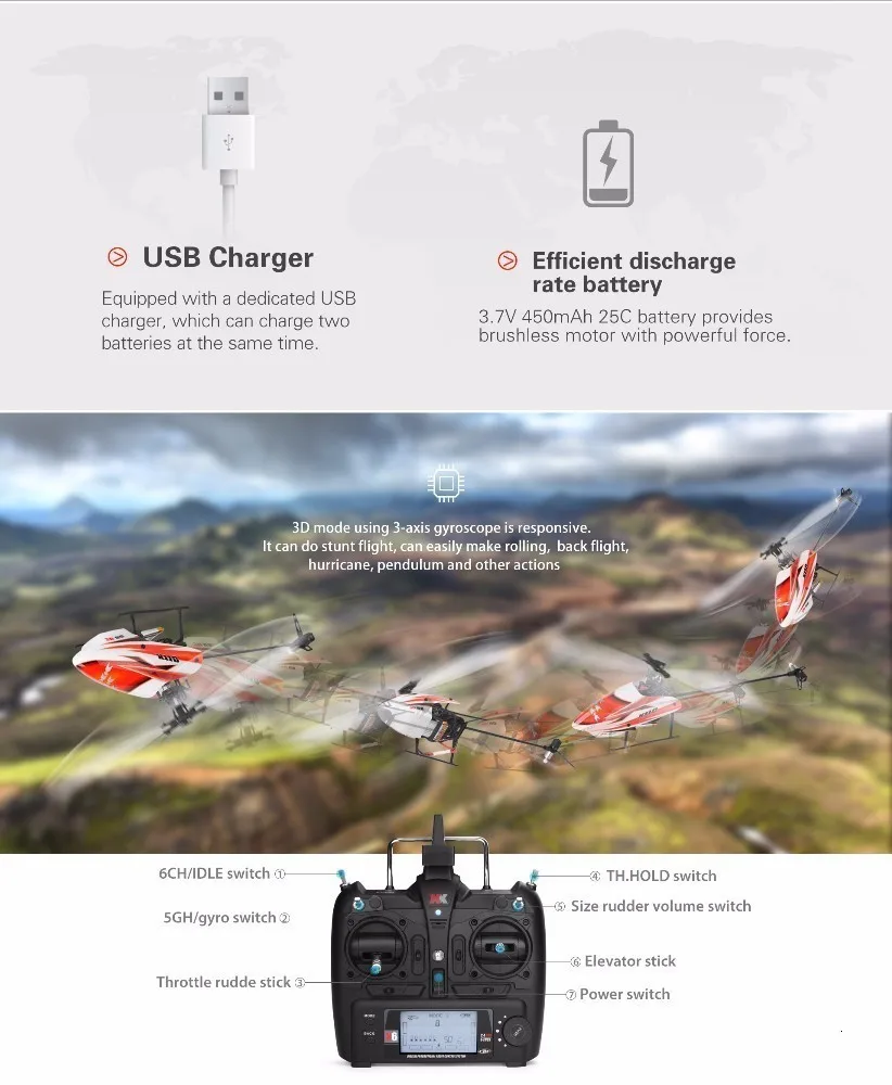 Особенности: 1. Беспилотный CP Вертолет, аэродинамически разработанный для достижения непревзойденной стабильности 2. Аккумулятор 1S 3,7 V 450mAh 25C 3. Бесщеточный двигатель (1106) 4. Передатчик имеет переключатель холостого хода 3D aka, переключатель удержания дроссельной заслонки, большой ЖК-дисплей, предупреждение низкого напряжения. Настройка промежуточной точки позволяет устанавливать точку зависания. 5. Передатчик поддерживает связь с переключением с диагональю экрана 3-axis & 6 оси гироскопа режимов 6. 3D Активирует режим 3 оси гироскопа, обеспечивает аэробику, такую как flips и функциями перевернутого полета, воронки и Тик-tocks 7. Нормальный (aka 6G) активирует 6-осевой гироскоп, обеспечивает стабильный полет, подходит для начинающих 8. USB зарядное устройство 2 за раз 9. Летающий Вес: 48,5 г; Время полета: 6-7 минут