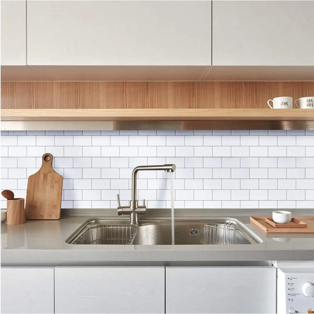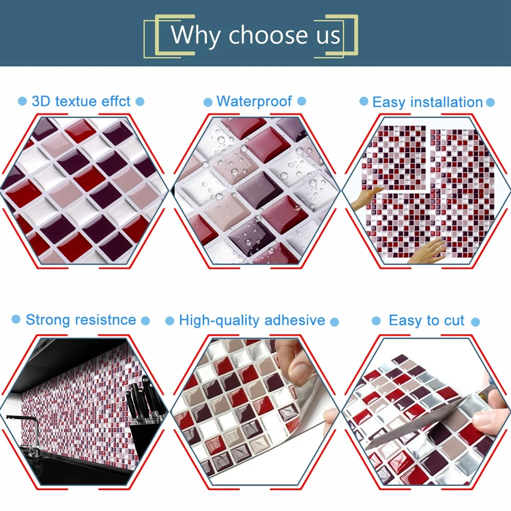 Особенности и преимущества 1: эффект 3D, практически не отличается от реальной плитки 2: Простота установки, обслуживания и очистки 3: устойчив к пятнам, выцветанию, влаге и плесени 4: без затирки, без клея, без специального инструмента и беспорядка. Его можно установить в течение нескольких минут на чистую, сухую, ровную и гладкую поверхность. 5: плотно приклеивается и не выключается