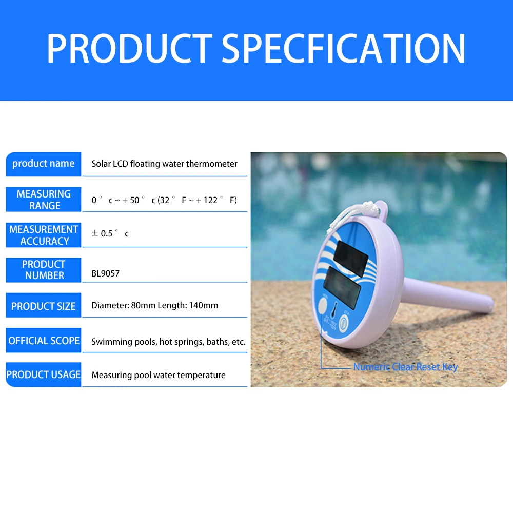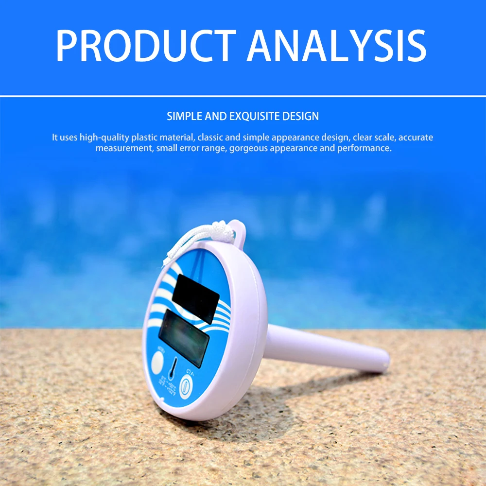 Изготовлено из гладкого поверхностного пластикового материала, плавающий термометр имеет две кнопки для удобства работы, одна для сброса, другая для переключения по Фаренгейту/Цельсию.