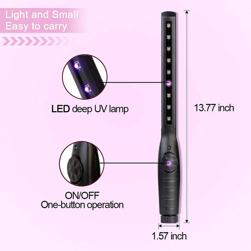 Features: 【EASY TO USE】With one Wheel Switch Turn On Button and USB Charger. Press the on/ off button 3 seconds. 【SAFE TO USE】The UV lamp will turn off automatically when it faces upwards or upright to ensure user safety. 【BEST PERFORMANCE】UV sterilizer light + ozone double sterilization, eliminating bacteria rate of 99%,which does not need long time and can be automatically extinguished. 【WIDELY USED】UV Sterilization for computer laptop keyboard disinfection, toilet, bedding, crawling mat, Crib, pet supplies disinfection, living room, bedroom, bathroom, kitchen, refrigerator, shoe cabinet, car, pet nest, etc... Specification: Name: LED rechargeable UV disinfection stick UV wavelength: 270-280mm Tube: LED deep ultraviolet lamp beads Lamp life: more than 20000 hours Size: 350x40x35mm Power: 1.8W Optimal sterilization distance: 1-5 cm Sterilization time: 5-10 seconds Duration: 4 hours of continuous discharge Battery: Lithium battery for 1-2 hours Net weight: 144g Packing included: 1 x LED Charging UV Sterilizer Note: 1. Please allow 1-3cm (0.4-1.18") difference due to manual measurement and slight color variation for different display setting. 2. Due to the light and screen difference, the item's color may be slightly different from the pictures. Please understand.