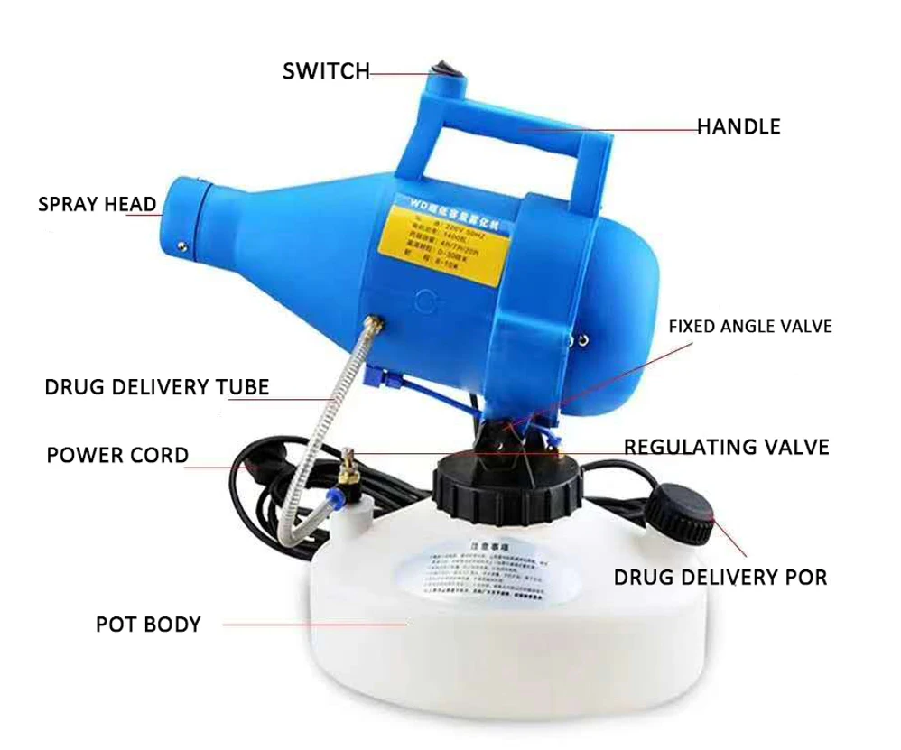 Модель: Электрический ULV опрыскиватель Емкость коробки для лекарств: 4,5л Мощность: 1400W Объем распыления: 150-260 мл/мин (регулируется) Источник питания: 110-220 В Диапазон: 5-10 метров Длина шнура питания: 5 метров Распыленные частицы: 20 микрон (регулируемый)