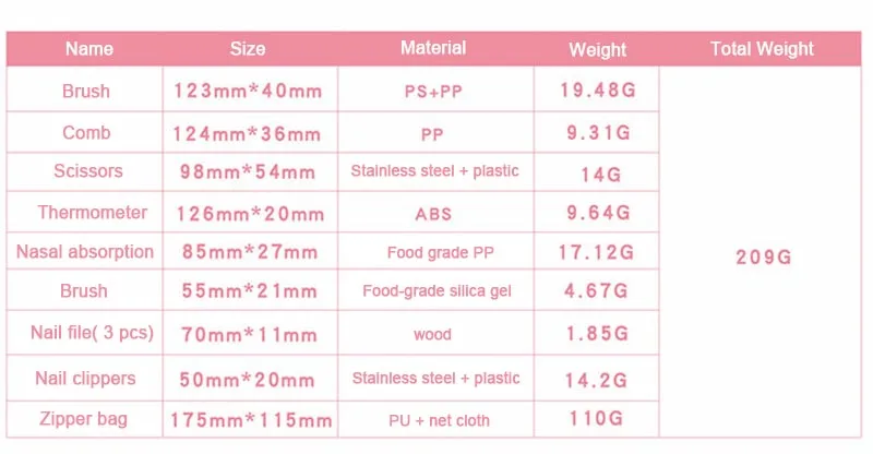Особенности:Наименование: комплект для ухода за ребенкомWighte: 0,2Материал: ПП + пс + абс + нержавеющая сталь + пластикПодходит для всех типов кожиРазмер сумки: 18*15*5,5 смПодходящий возраст: 0-5 летЦвет: синий, розовый, желтыйСмотрите так же другие товары: