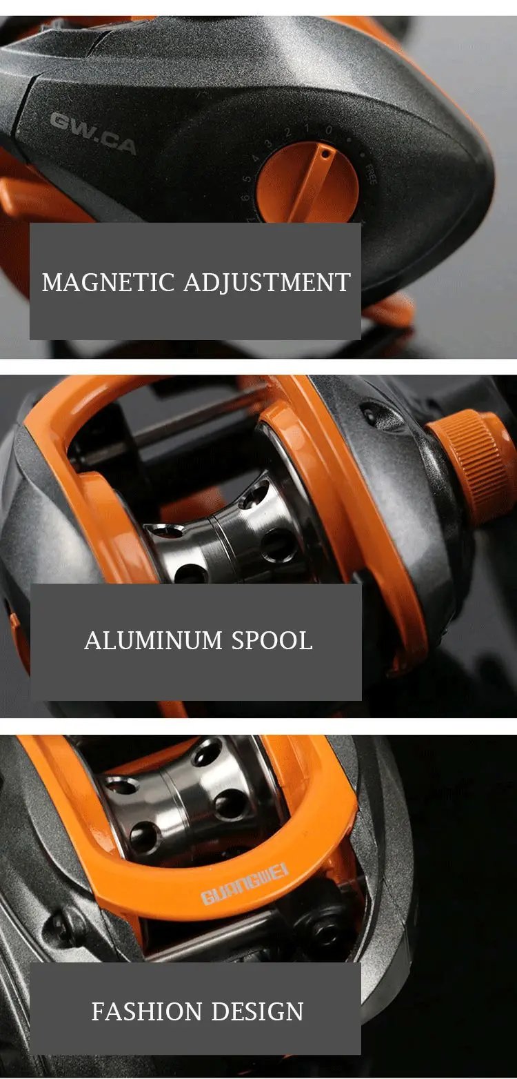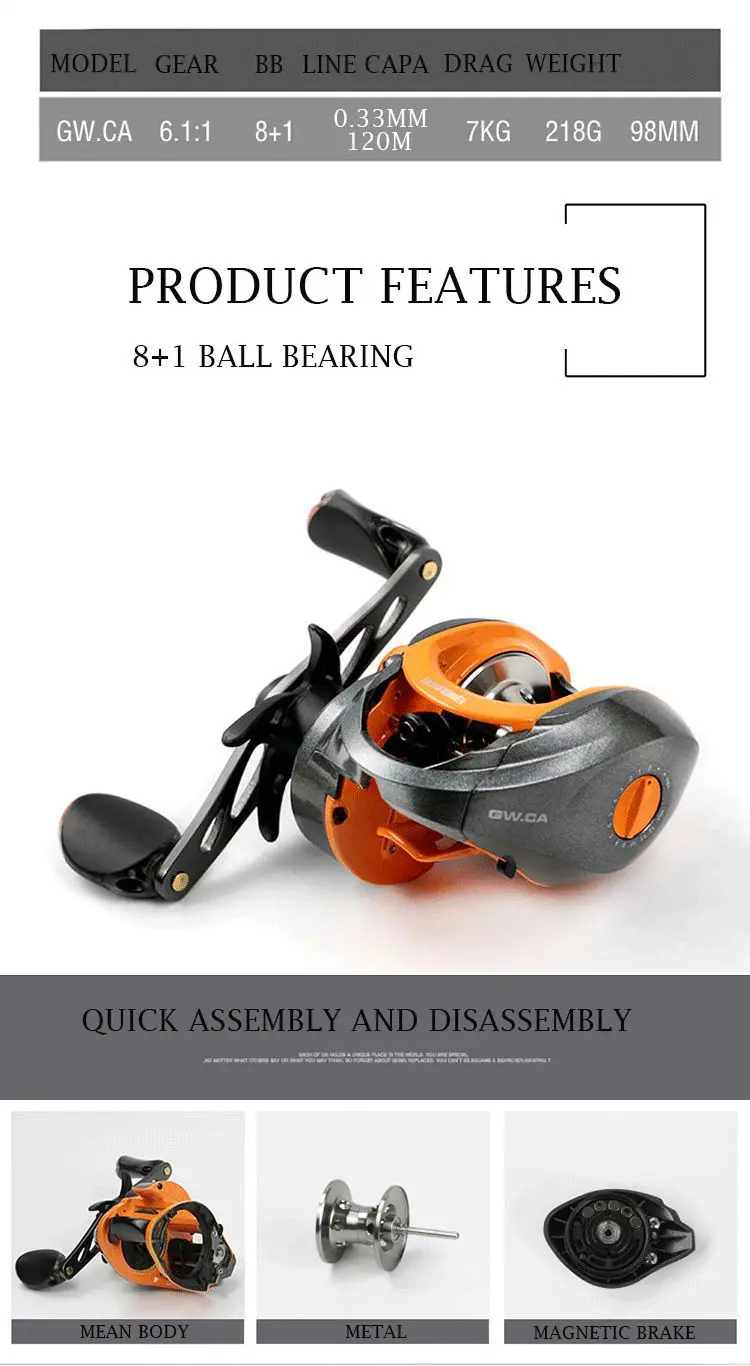 * GW CA Elite 8 + 1BB * Алюминиевая катушка с ЧПУ * Высокопрочная шестерня и магнитный тормоз * Отличная система колебания линии * Плавная Стабильная производительность * Полностью регулируемый литой контроль * Звездный ключ * Алюминиевая левая/правая ручка * Сила сопротивления 7 кг, вес: 218 г * До 7 кг плавного сопротивления"