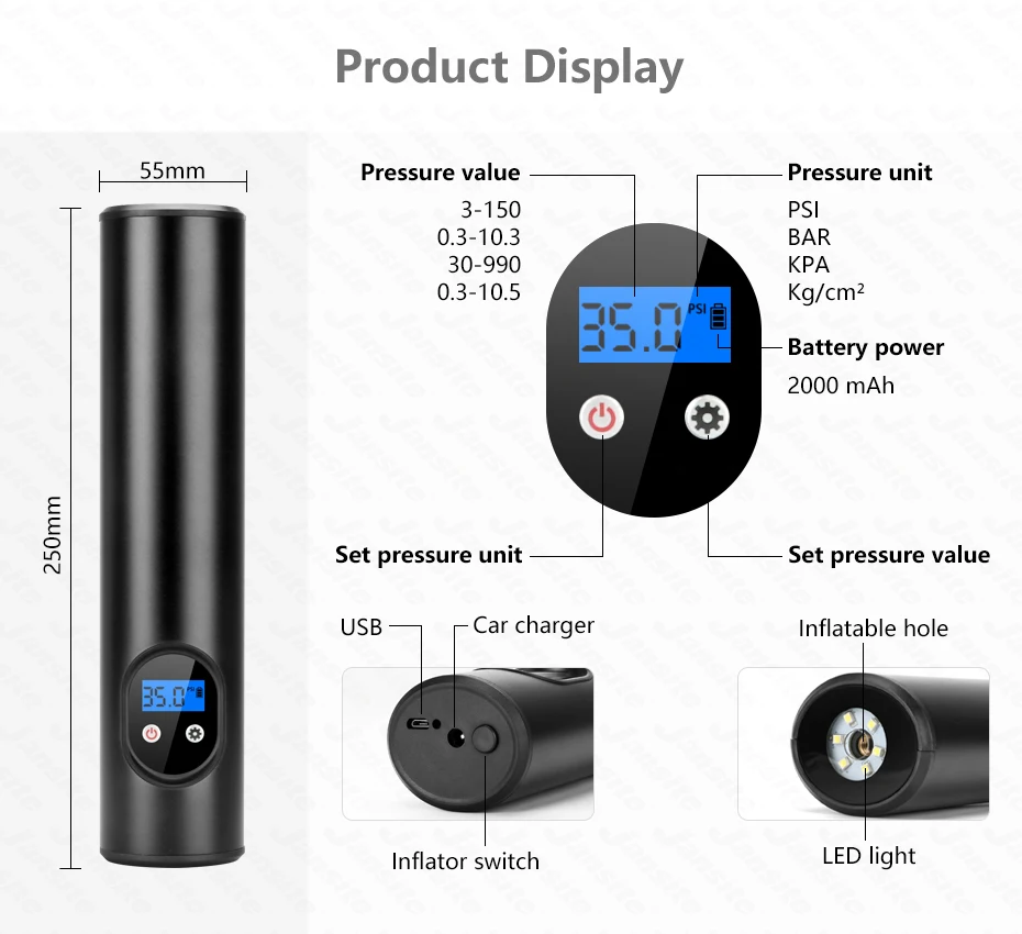 Простота в использовании:Шаг 1: Отверните сердцевина клапана шины hosetoШаг 2: Нажмите кнопку питания, чтобы включить устройство и переключить устройство. Нажмите кнопку настройки, чтобы настроить значение нажатия.Шаг 3: переключатель Presson и запуск для надуванияШаг 4: после надувания снимите трубку![]()