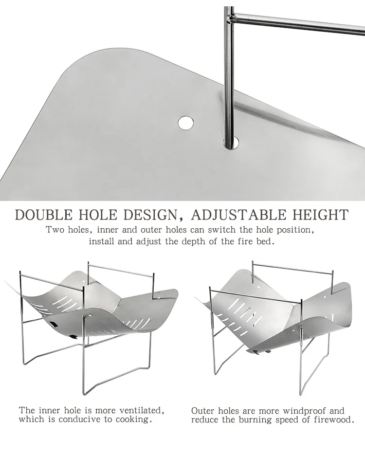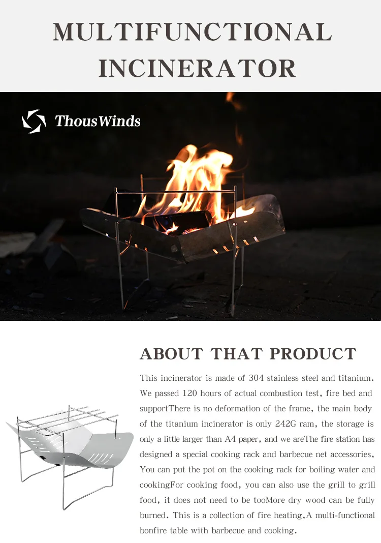 feature:The incinerator is made of titanium and 304 stainless steel. We passed the 120-hour actual combustion test. The fire bed and support are not deformed. The main body of the titanium incinerator is only 242 grams, and the storage space is only a little larger than that of A4 paper. The incinerator has a special cooking rack and grill accessories. You can place the pot on the cooking rack to boil water and cook food. You can also use the grill net to grill food. It does not require much dry wood. Can be completely burned. This is a multi-functional bonfire table integrating bonfire, heating, barbecue and cooking. Brand: Thous WindsModel: TW1001Product name: Multifunctional IncineratorMaterial: 304 stainless steelMaximum load: 10KGWeight: 411g of multi-function incinerator body, 152g of cooking rack (gift)Main body unfolded using dimensions: length 39.5 cm * width 25.2 cm * height 23.5 cmCooking table size: length 31cm * width 6cmStorage and packaging size: length 32.4cm * width 24cm * height 1cm Model: TW1002Product name: Multifunctional IncineratorMaterial: TitaniumMaximum load: 10KGWeight: Multifunctional incinerator body 242g, cooking rack 86g (gift)Main body unfolded using dimensions: length 39.5 cm * width 25.2 cm * height 23.5 cmCooking table size: length 31cm * width 6cmStorage and packaging size: length 32.4cm * width 24cm * height 1cm