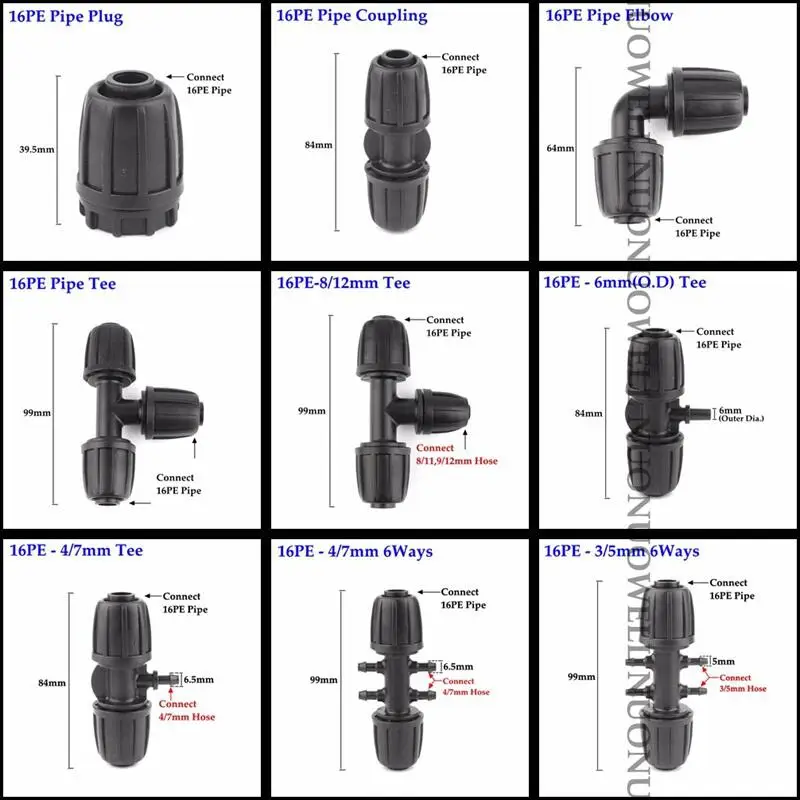 16PE Pipe Plug 16PE Pipe Straight Connector 16PE Pipe Elbow Connector 16PE Pipe Tee Connector 16PE-8/12mm Pipe Tee Connector 16PE -4/7mm Tee Connector 16PE-O.D6mm Tee Connector 16PE-4/7mm 6Ways Connector 16PE-3/5mm 6Ways Connector 16PE-O.D6mm 6Ways Connector
