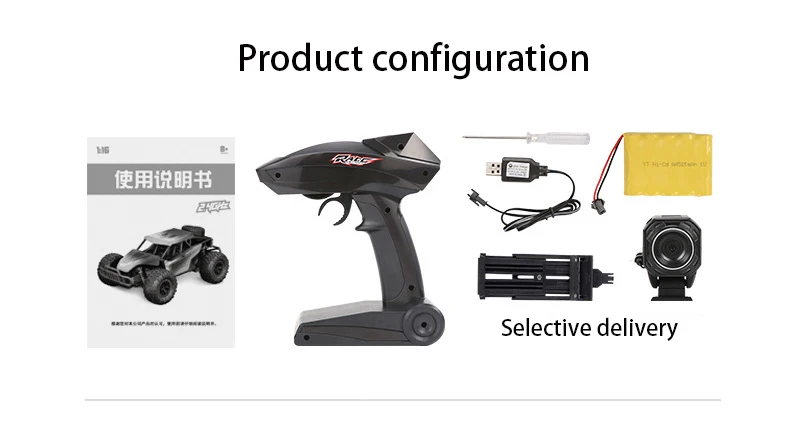 1 x автомобиль; 1 x передатчик; 1 x Зарядное устройство; 1 x камера (зависит от вашего выбора),1 x другие части
